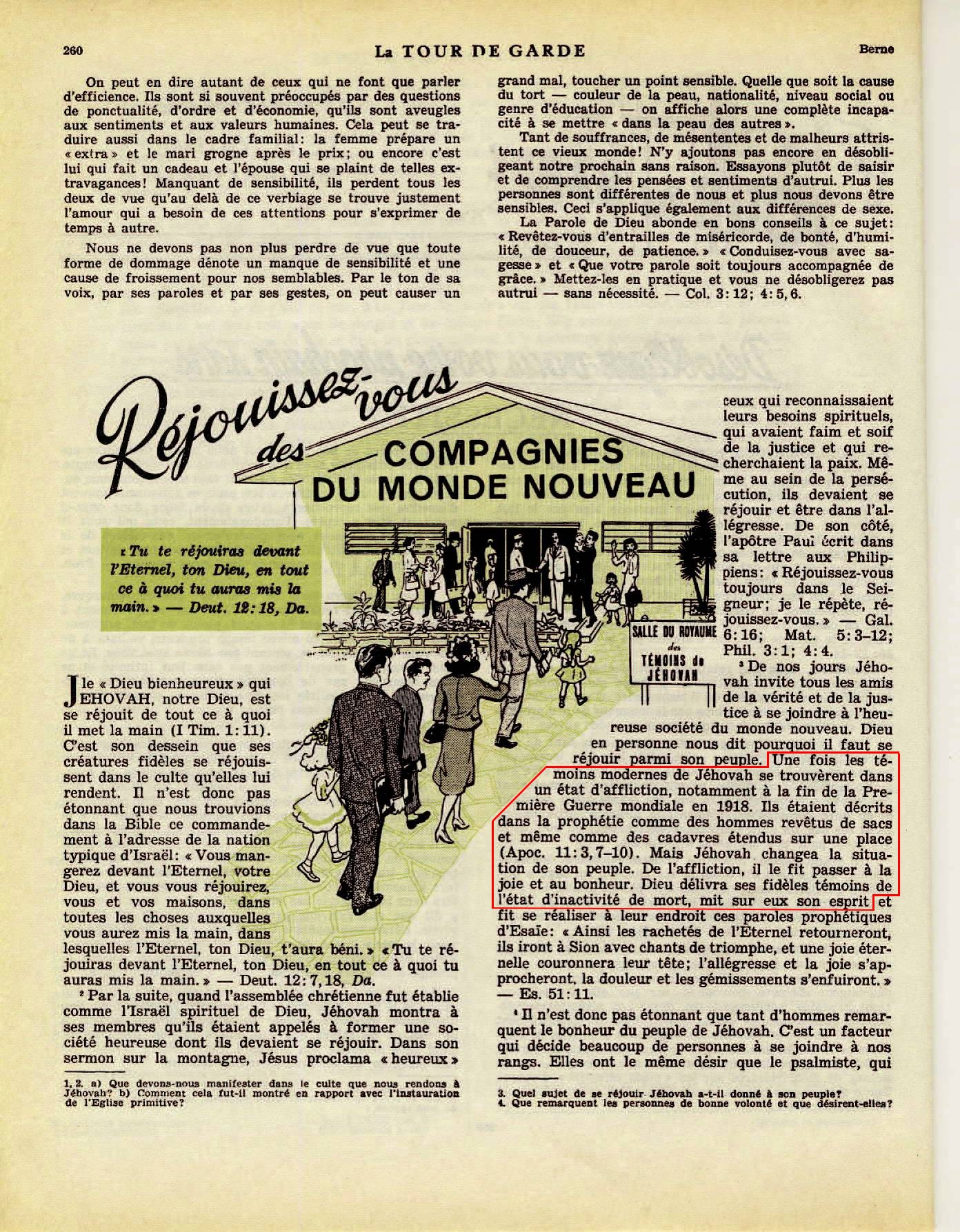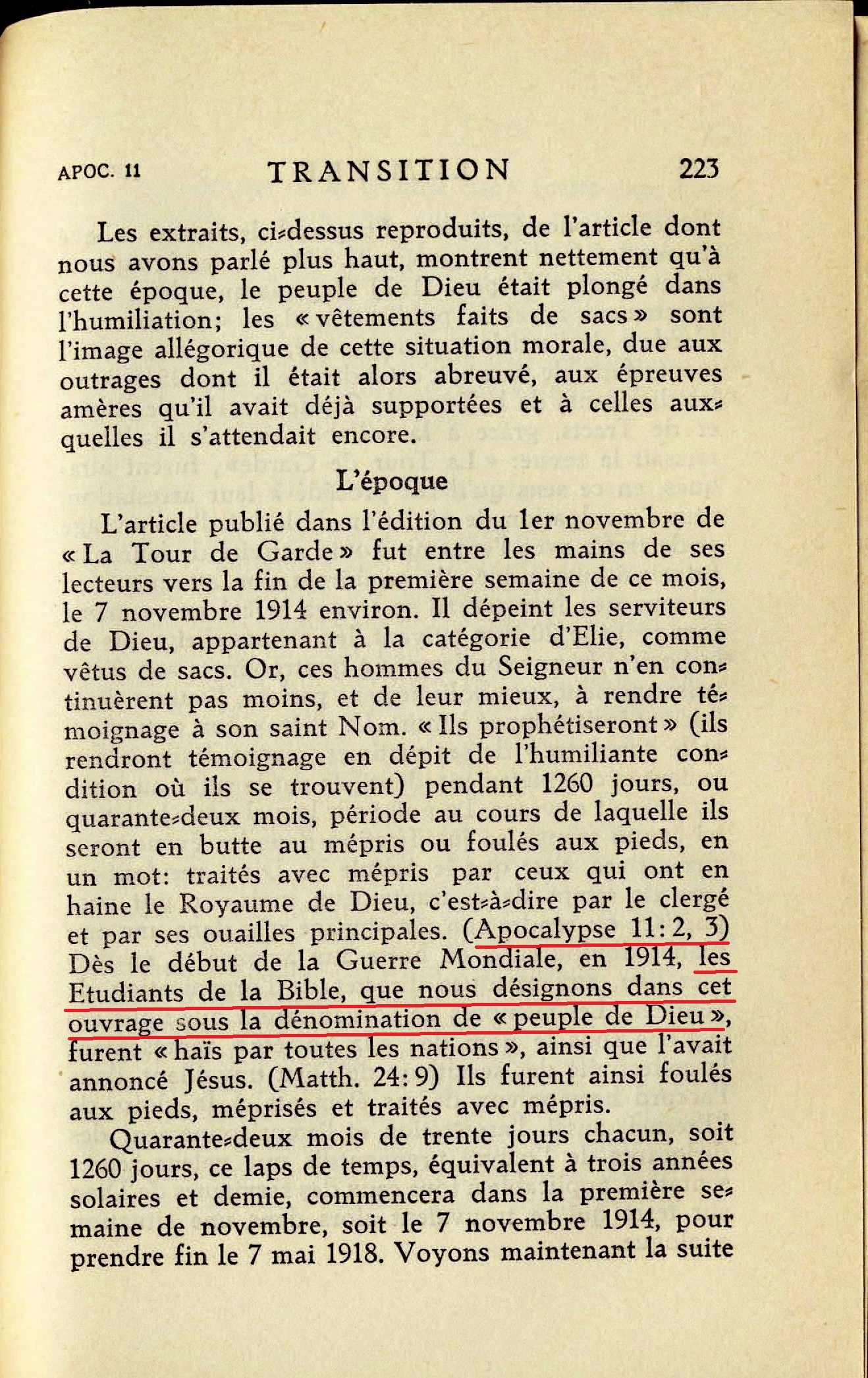 L'époque L'article publié dans l'édition du 1 er novembre de "La Tour de Garde" fut entre les mains de ses lecteurs vers la fin de la première semaine de ce mois, le 7 novembre 1914 environ. Il dépeint les serviteurs de Dieu, appartenant à la catégorie d'Elie, comme vêtus de sacs. [...] "Ils prophétiseront" (ils rendront témoignage en dépit de l'humiliante condition où ils se trouvent) pendant 1260 jours, ou quarante-deux mois, [...] (Apocalypse 11:2,3) Dès le début de la Guerre Mondiale, en 1914, les Etudiants de la Bible, que nous désignons dans cet ouvrage sous la dénomination de "peuple de Dieu", furent "haïs par toutes les nations", ainsi que l'avait annoncé Jésus. (Matth. 24:9) Ils furent ainsi foulés aux pieds, méprisés et traités avec mépris. Quarante-deux mois de trente jours chacun, soit 1260 jours, ce laps de temps, équivalent à trois années solaires et demie, commencera dans la première semaine de novembre, soit le 7 novembre 1914, pour prendre fin le 7 mai 1918. [...] Le point sur lequel nous insistons ici et qui trouve sa justification dans les événements eux-mêmes, c'est que le peuple de Dieu; pendant un laps de temps de quarante-deux mois, ne put prophétiser ou rendre son témoignage que dans une ambiance douloureuse, en butte aux avanies et, en dernier lieu, aux attaques directes de l'organisation de l'ennemi. Source : 🇫🇷 1930 - Lumière, vol 1, page 223, page 224 + Cover |