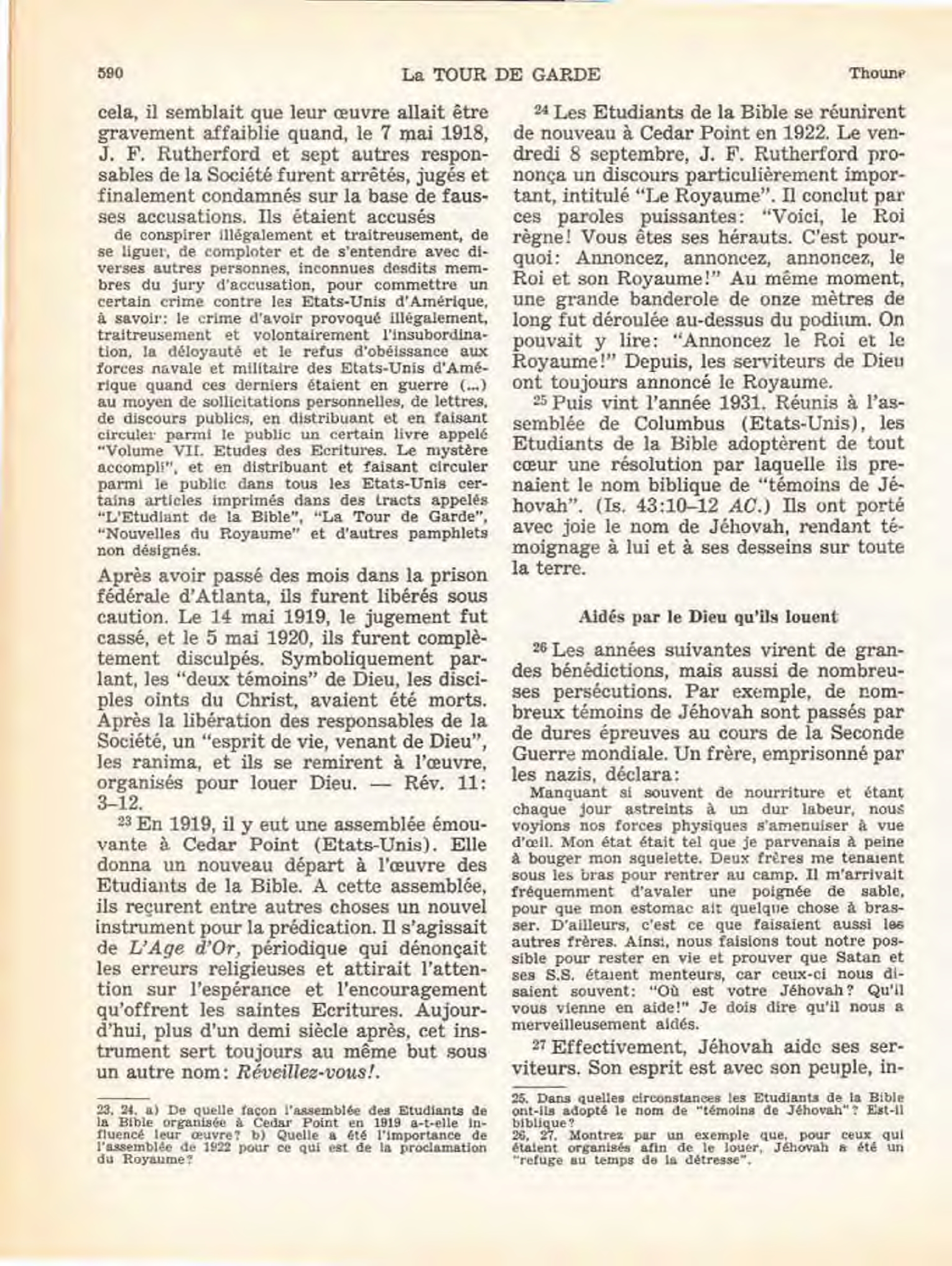 J. F. Rutherford et sept autres responsables de la Société furent arrêtés, jugés et finalement condamnés sur la base de fausses accusations. [...] Après avoir passé des mois dans la prison fédérale d'Atlanta, ils furent libérés sous caution. Le 14 mai 1919, le jugement fut cassé, et le 5 mai 1920, ils furent complètement disculpés. Symboliquement parlant, les "deux témoins" de Dieu, les disciples oints du Christ, avaient été morts. Après la libération des responsables de la Société, un "esprit de vie, venant de Dieu", les ranima, et ils se remirent à l'oeuvre, organisés pour louer Dieu. — Rév. 11:3-12.