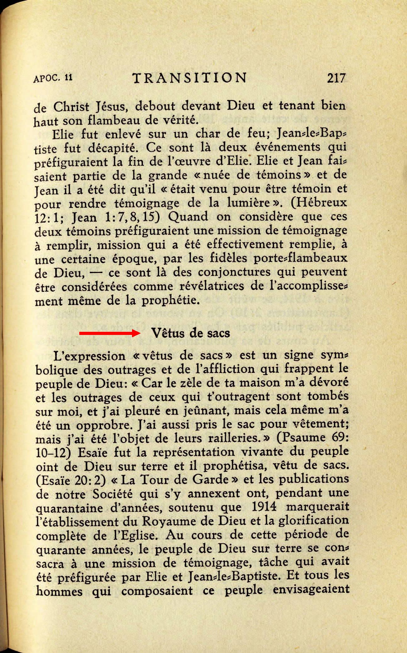 L'expression "vêtus de sacs" est un signe symbolique des outrages et de l'affliction qui frappent le peuple de Dieu: "Car le zèle de ta maison m'a dévoré et les outrages de ceux qui t'outragent sont tombés sur moi, et j'ai pleuré en jeûnant, mais cela même m'a été un opprobre. J'ai aussi pris le sac pour vêtement; mais j'ai été l'objet de leurs railleries." (Psaume 69:10-12) Source : 🇫🇷 1930 - Lumière, vol 1, page 217 + Cover |