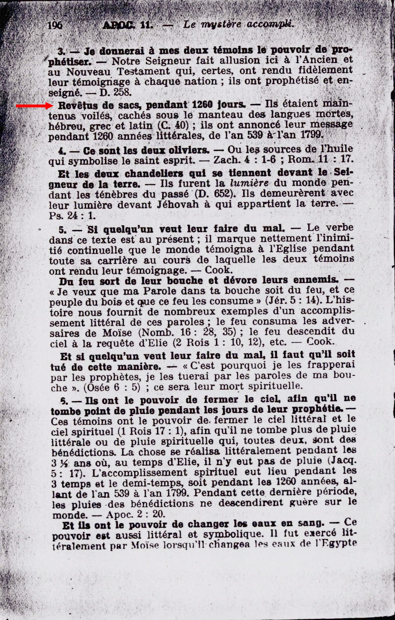3. - Je donnerai à mes deux témoins le pouvoir de prophétiser. - Notre Seigneur fait allusion ici à l'Ancien et au Nouveau Testament qui, certes, ont rendu fidèlement leur témoignage à chaque nation; ils ont prophétisé et enseigné. Revêtus de sacs, pendant 1260 jours - Ils étaient maintenus voilés, cachés sous le manteau des langues mortes, hébreu, grec et latin (C40); Ils ont annoncé leur message pendant 1260 années littérales, de l'an 539 à l'an 1799. Source : 🇫🇷 1917 - Le Mystère Accompli, page 196 + Cover |