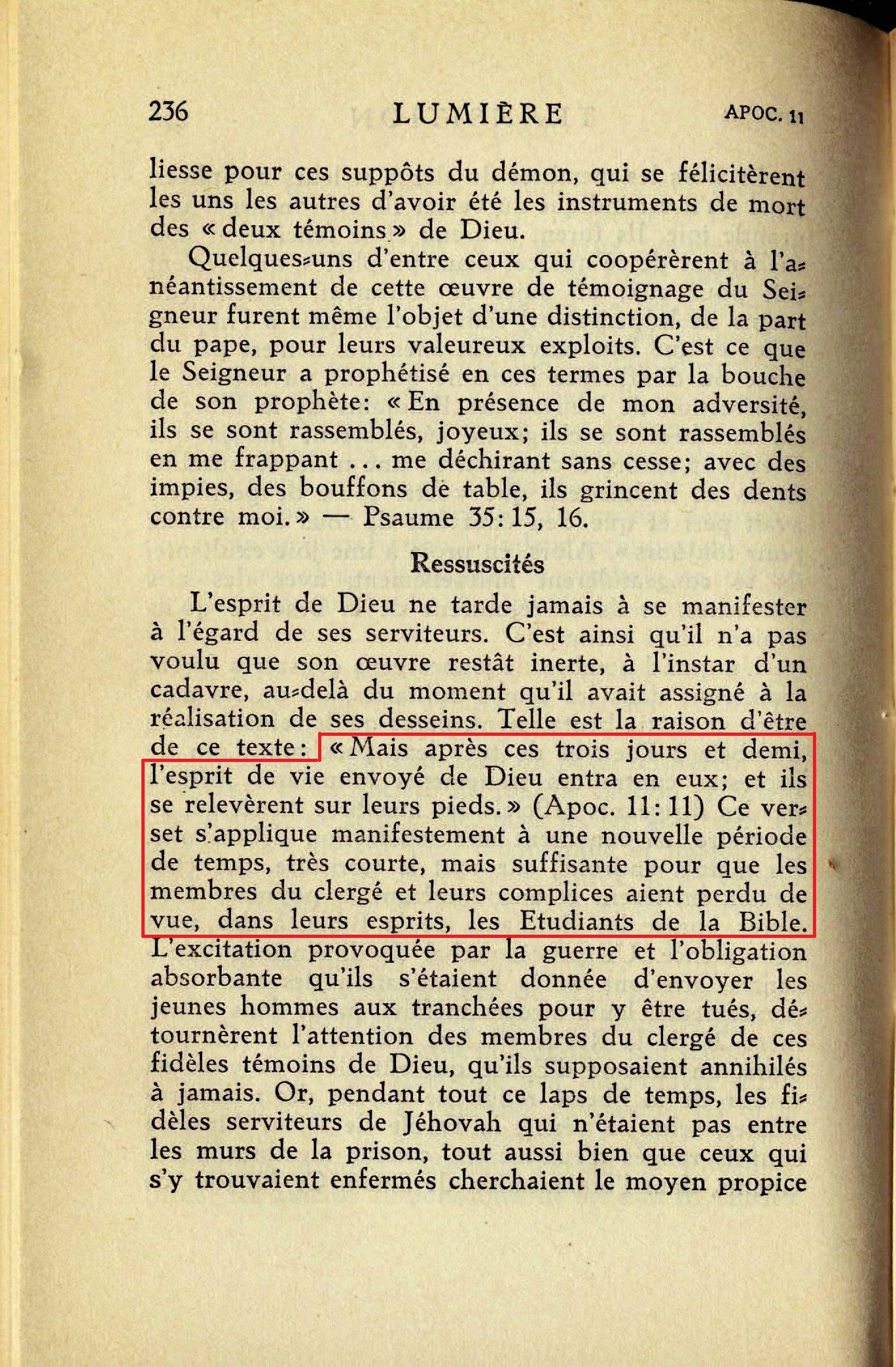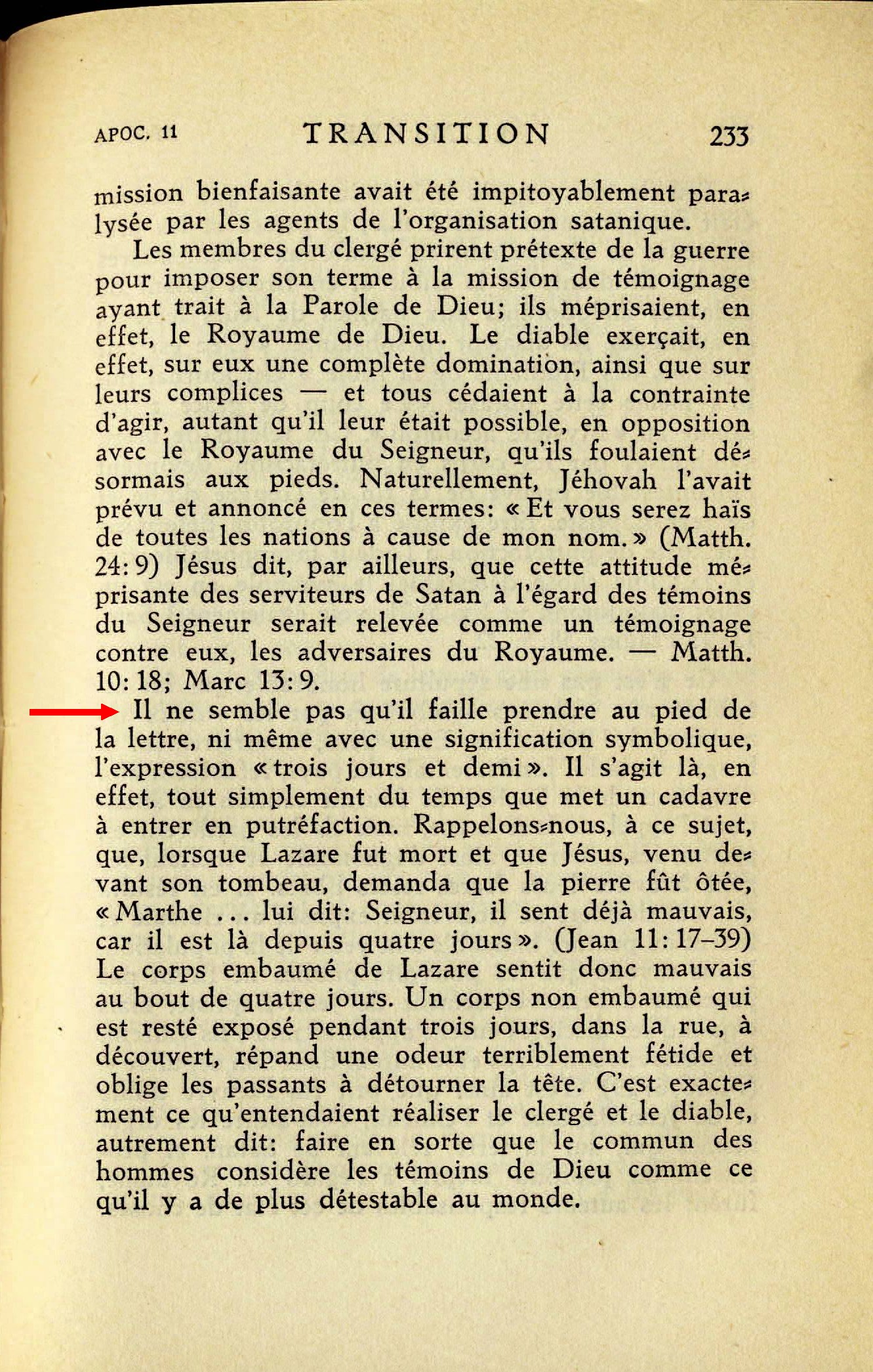 Il ne semble pas qu'il faille prendre au pied de la lettre, ni même avec une signification symbolique, l'expression "trois jours et demi". Il s'agit là, en effet, tout simplement du temps que met un cadavre à entrer en putréfaction [...] "Mais après ces trois jours et demi, l'esprit de vie envoyé de Dieu entre en eux; et ils se relevèrent sur leurs pieds." (Apoc. 11:11) Ce verset s'applique manifestement à une nouvelle période de temps, très courte, mais suffisante pour que les membres du clergé et leurs complices aient perdu de vue, dans leurs esprits, les Etudiants de la Bible.