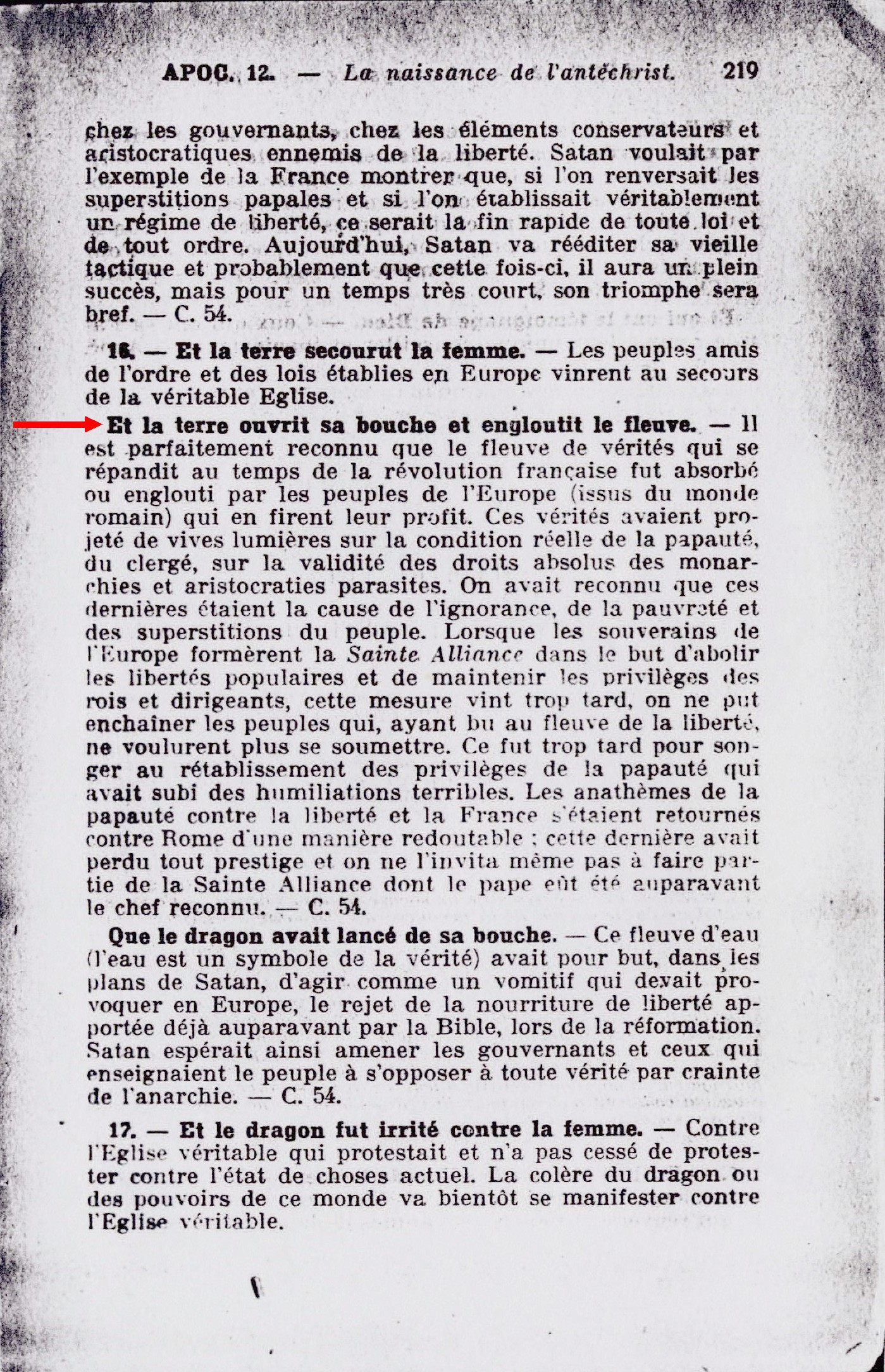 Et la terre ouvrit sa bouche et engloutit le fleuve. - Il est parfaitement reconnu que le fleuve de vérités qui se répandit au temps de la révolution française fut absorbé ou englouti par les peuples de l'Europe (issus du monde romain) qui en firent leur profit [...] lorsque les souverains de l'Europe formèrent la sainte Alliance dans le but d'abolir les libertés populaires et de maintenir les privilèges des rois et dirigeants, cette mesure vint trop tard, on ne put enchaîner les peuples qui, ayant bu au fleuve de la liberté de la liberté, ne voulurent plus se soumettre [...] Les anathèmes de la papauté contre le liberté et la France s'étaient retournés contre Rome d'une manière redoutable ; cette dernière avait perdu tout prestige et on ne l'invita même pas à faire partie de la sainte Alliance dont le pape eut été auparavant le chef reconnu. - C.54. Source : 🇫🇷 1917 - Le Mystere Accompli, page 219 + Cover |