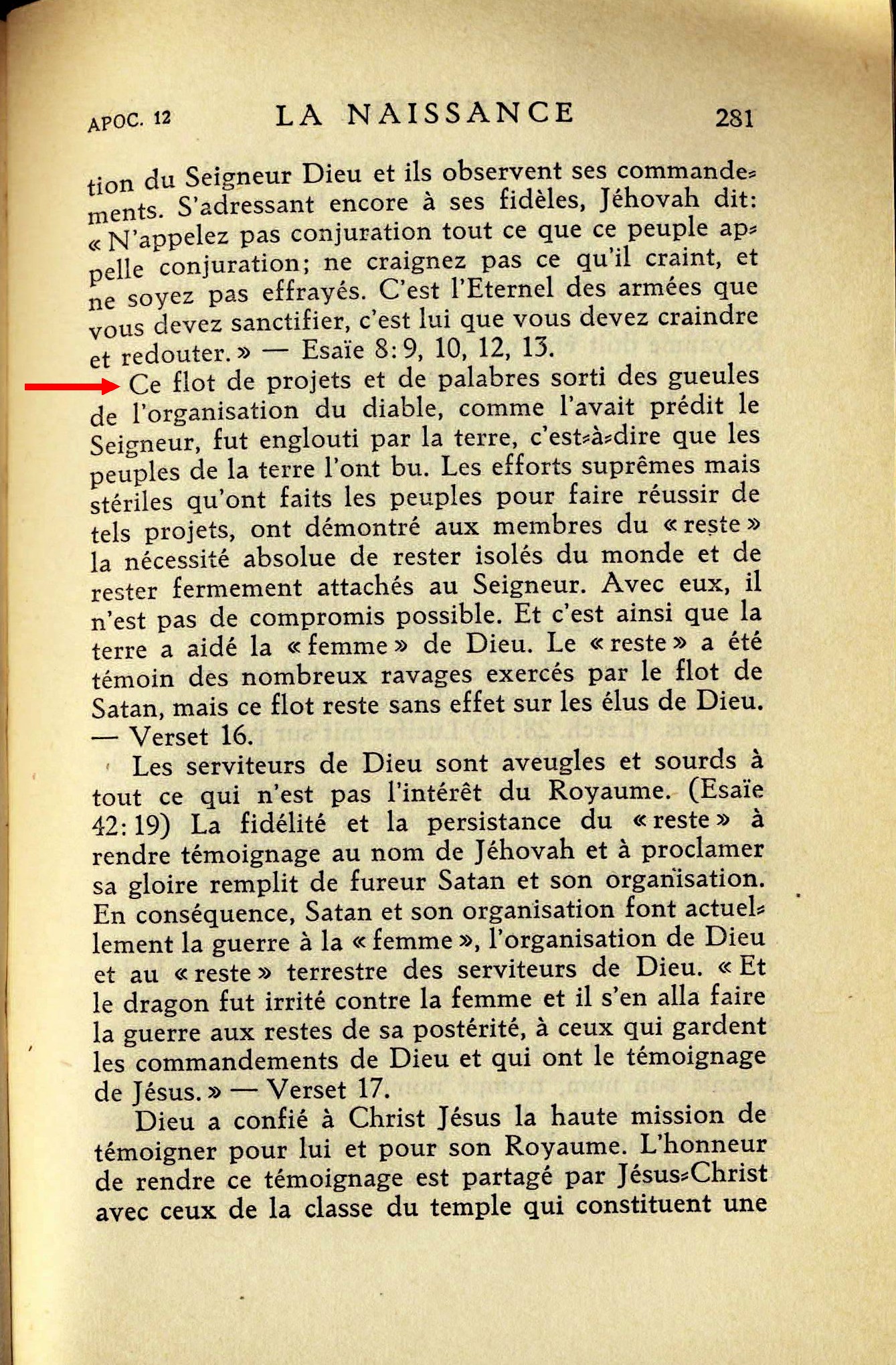 Ce flot de projets et de palabres sorti des gueules de l'organisation du diable, comme l'avait prédit le seigneur, fut englouti par la terre, c'est-à-dire que les peuples de la terre l'ont bu. Les efforts suprêmes mais stériles qu'ont faits les peuples pour faire réussir de tels projets, ont démontré aux membres du "reste" la nécessité absolue de rester isolés du monde et de rester fermement attachés au Seigneur. Avec eux, il n'est pas de compromis possible. Et c'est ainsi que la terre a aidé le "femme" de Dieu. Le "reste" a été témoin des nombreux ravages exercés par le flot de Satan, mais ce flot reste sans effet sur les élus de Dieu. - verset 16. Source : 🇫🇷 1930 - Lumière, Vol 1, page 281 + Cover |