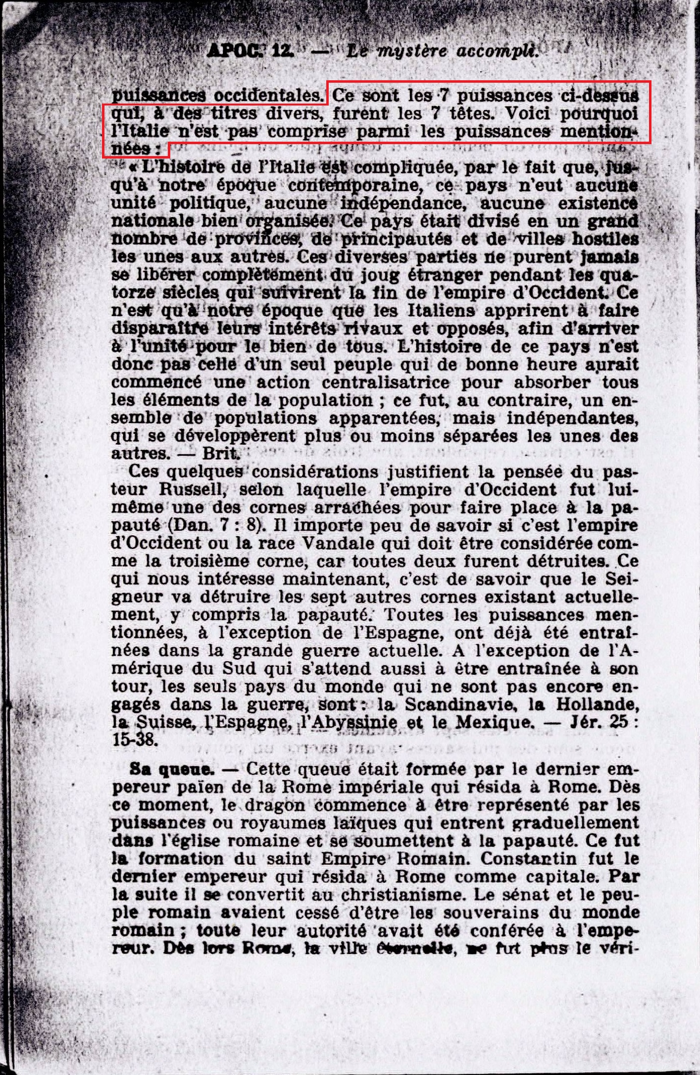 Ayant sept têtes et dix cornes. - L'expression symbolique "tête" désigne des pouvoirs ou royaumes (le terme roi désigne souvent aussi des royaumes plutôt que des personnalités). On peut aussi considérer comme les 7 têtes de l'empire romain (ou dragon) les 7 formes de gouvernement ou pouvoir qui se sont succédé dans le quatrième empire universel (empire romain ou monde comprenant aussi les états chrétiens actuels d'Europe ayant fait partie autrefois du Saint empire romain impérial et papal), celui dont parle Daniel (7:23); la papauté, elle-même, fut une de ces têtes. Voir Apoc. 17:9, 10; 13:3. Ces têtes désignent aussi plus spécialement 7 d'entre les 10 royaumes ou "cornes" qui, à un moment donné, surgissent dans l'empire romain et s'incorporent à lui en exerçant le pouvoir pendant un temps plus ou moins long. Les "cornes" sont donc aussi des puissances ou royaumes se rattachant à des degrès divers à l'empire romain... les grecs, les Lombards,... les Francs, les Bretons, les Saxons, les Visigoths et les Suèves [...] Et sur ses têtes sept diadèmes. - Les têtes avec le diadème sont des puissances ayant exercé un pouvoir effectif plus ou moins indépendant. [...] Ce sont les 7 puissances ci-dessus qui, à des titres divers, furent les 7 têtes. Voici pourquoi l'Italie n'est pas comprise parmi les puissances mentionnées. Source : 🇫🇷 1917 - Le Mystère Accompli, page 208, page 209, page 210 + Cover |