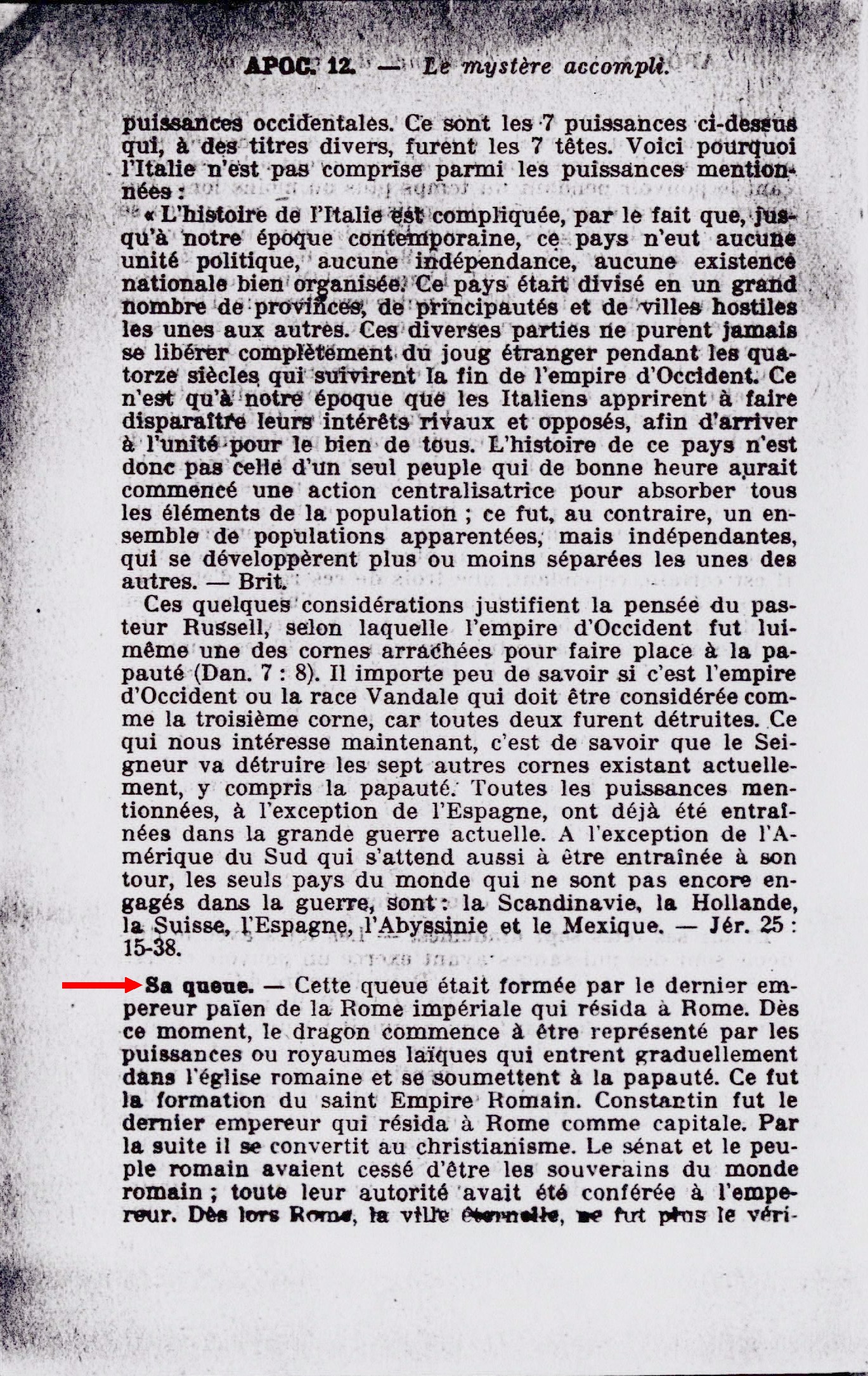 Sa queue. - Cette queue était formée par le dernier empereur païen de la Rome impériale qui résida à Rome. Dès ce moment, le dragon commence à être représenté par les puissances ou royaumes laïques qui entrent graduellement dans l'église romaine et se soumettent à la papauté. Ce fut la formation du saint Empire Romain. Constantin fut le dernier empereur qui résida à Rome comme capitale. Source : 🇫🇷 1917 - Le Mystère Accompli, page 210 + Cover |