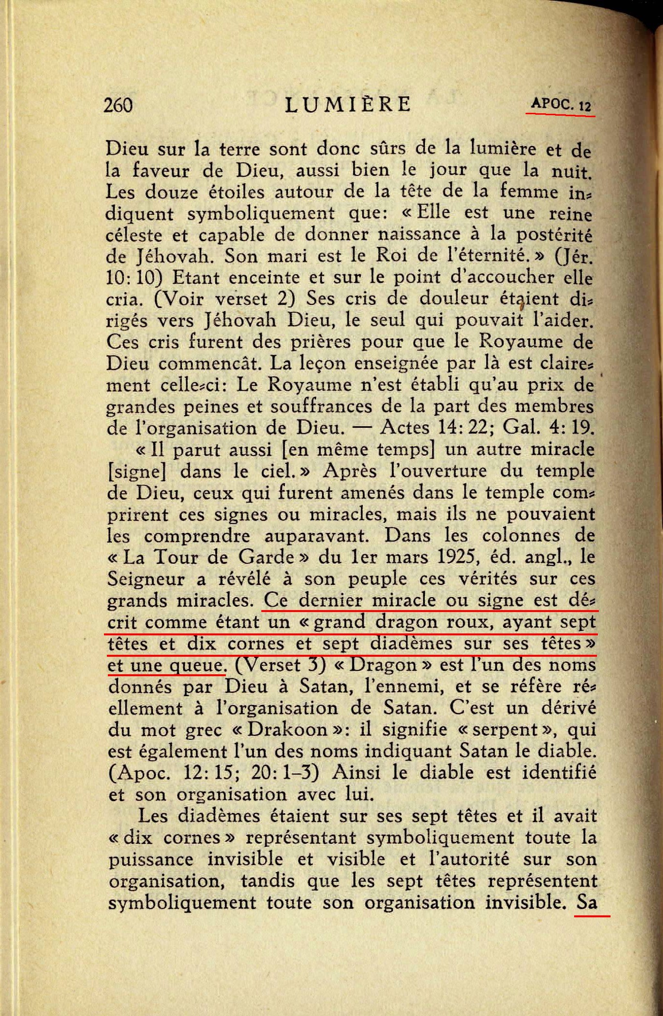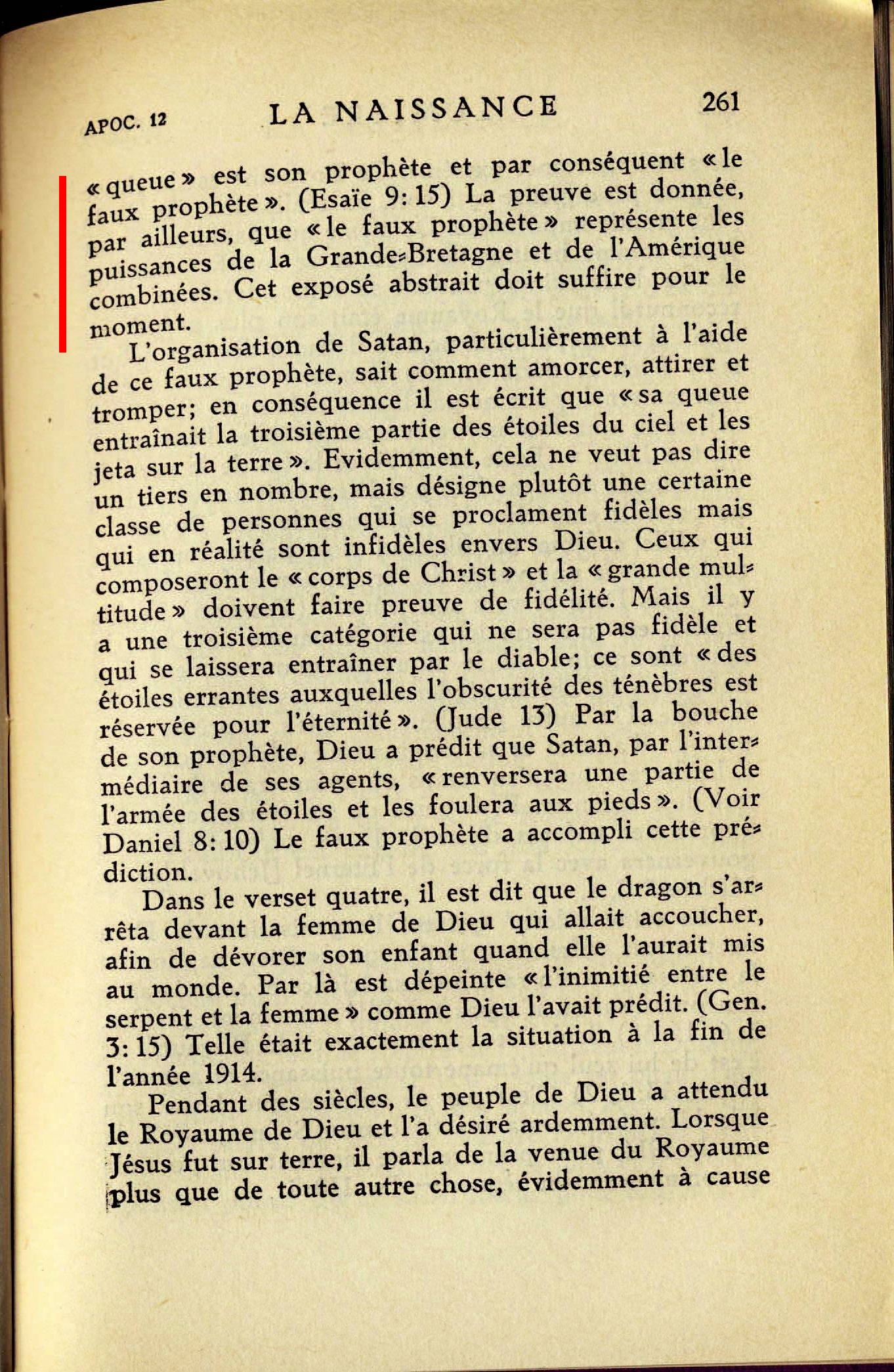Ce dernier miracle ou signe est décrit comme étant un "grand dragon roux, ayant sept têtes et dix cornes et sept diadèmes sur ses têtes" et une queue [...] Sa "queue" est son prophète et par conséquent "le faux prophète". (Esaïe 9:15) La preuve est donnée, par ailleurs, que "le faux prophète" représente les puissances de la Grande Bretagne et de l'Amérique combinée. Cet exposé abstrait doit suffire pour le moment.