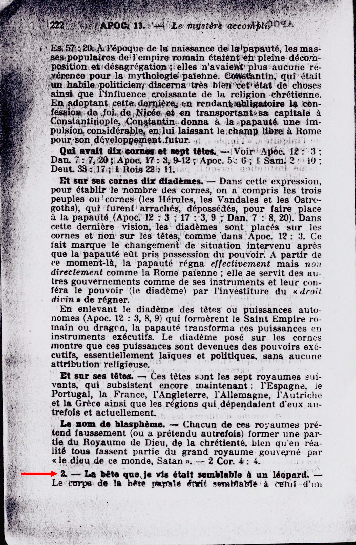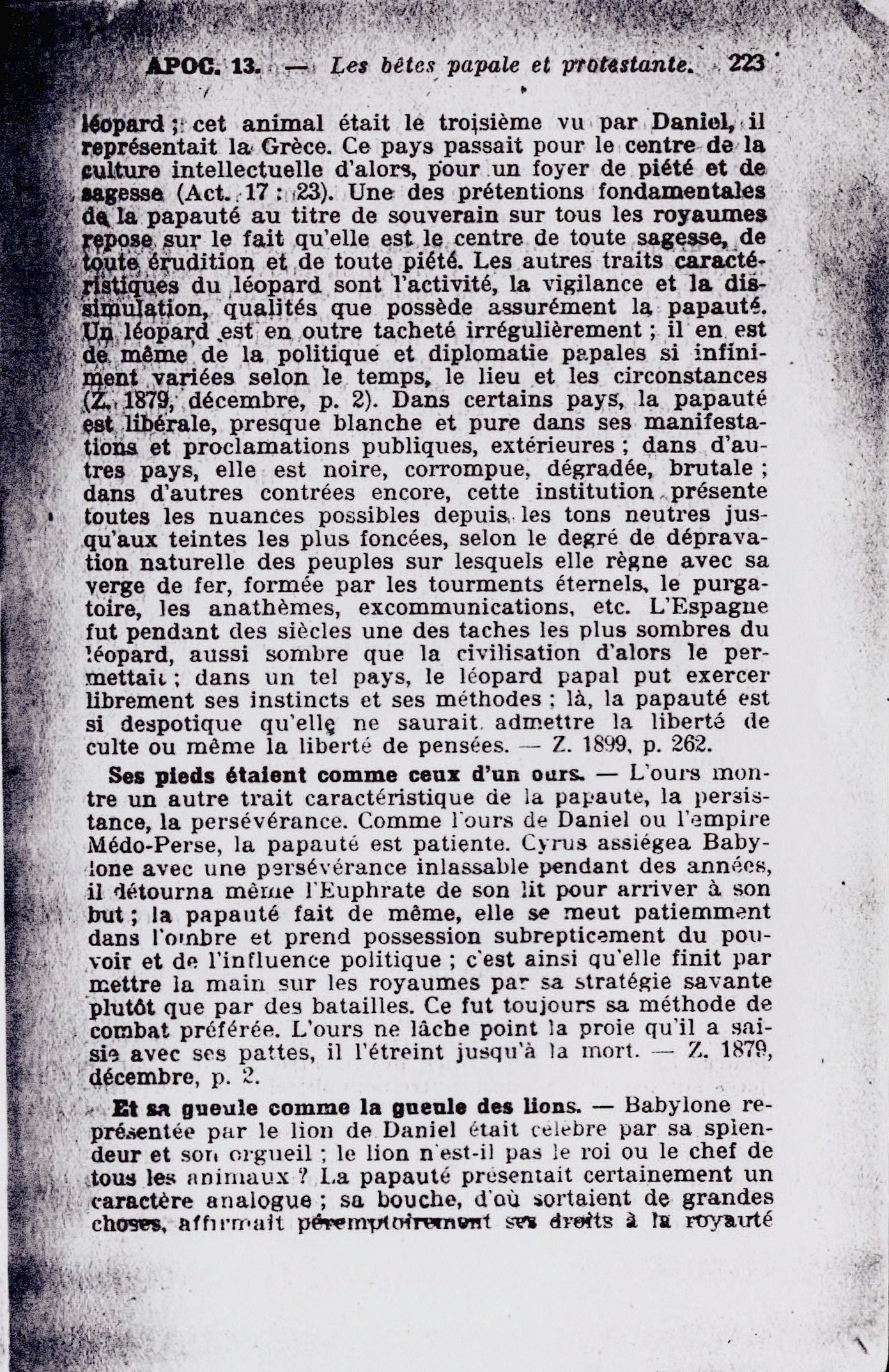 2. La bête que je vis était semblable à un léopard. - Le corps de la bête papale était semblable à celui d'un léopard; cet animal était le troisième vu par Daniel, il représentait la Grèce. Ce pays passait pour le center de la culture intellectuelle d'alors, pour un foyer de piété et de sagesse (Act. 17:23). Une des prétentions fondamentales de la papauté au titre de souverain sur tous les royaumes repose sur le fait qu'elle est le centre de toute sagesse, de toute érudition et de toute piété. Les autres traits caractéristiques du léopard sont l'activité, la vigilance et la dissimulation, qualités que possède assurément la papauté. Source : 🇫🇷 1917 - Le Mystere Accompli, page 222, page 223 + Cover |