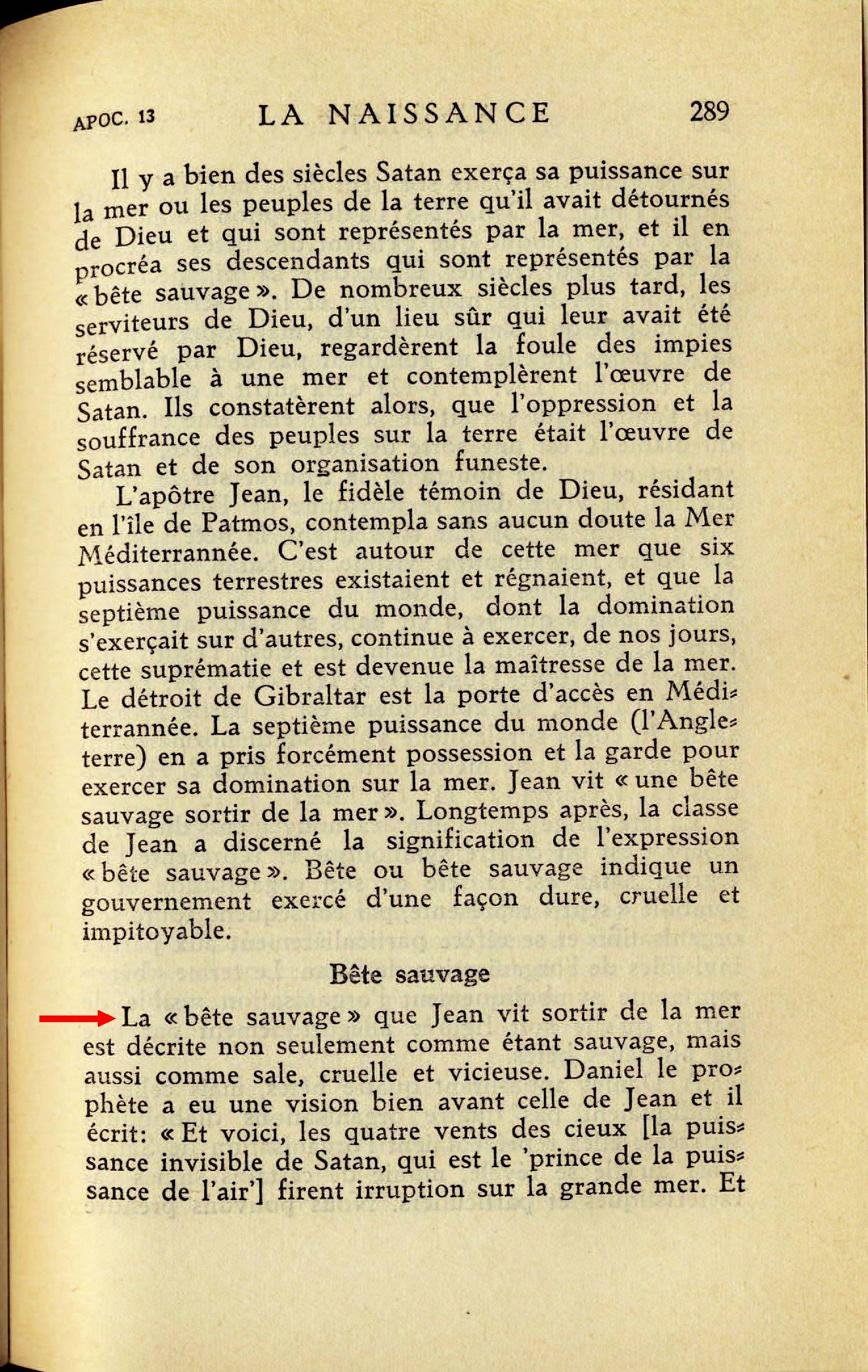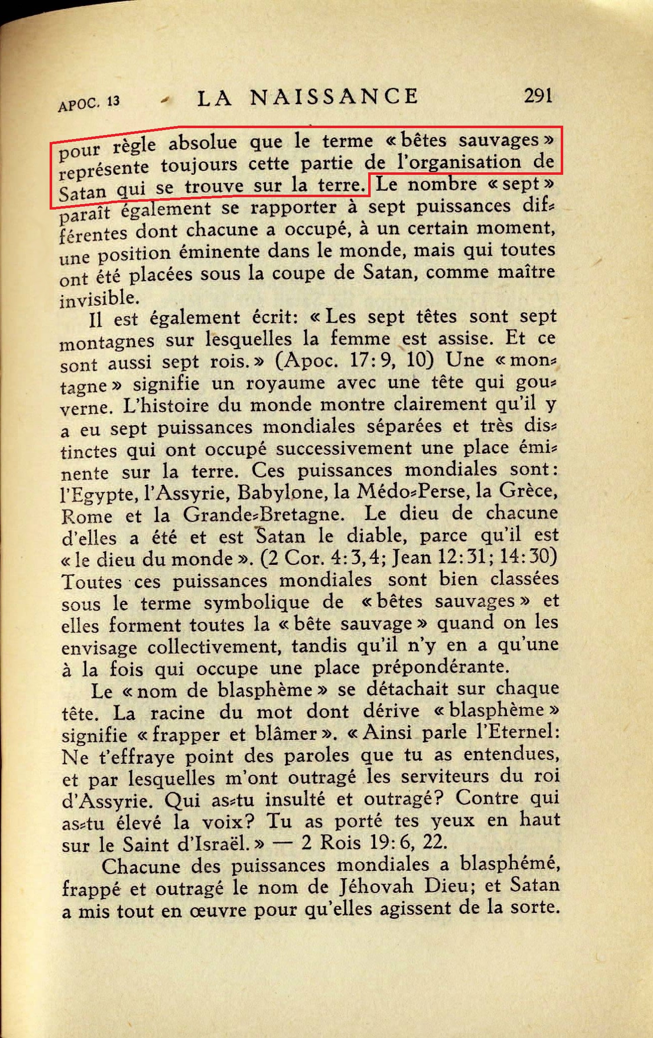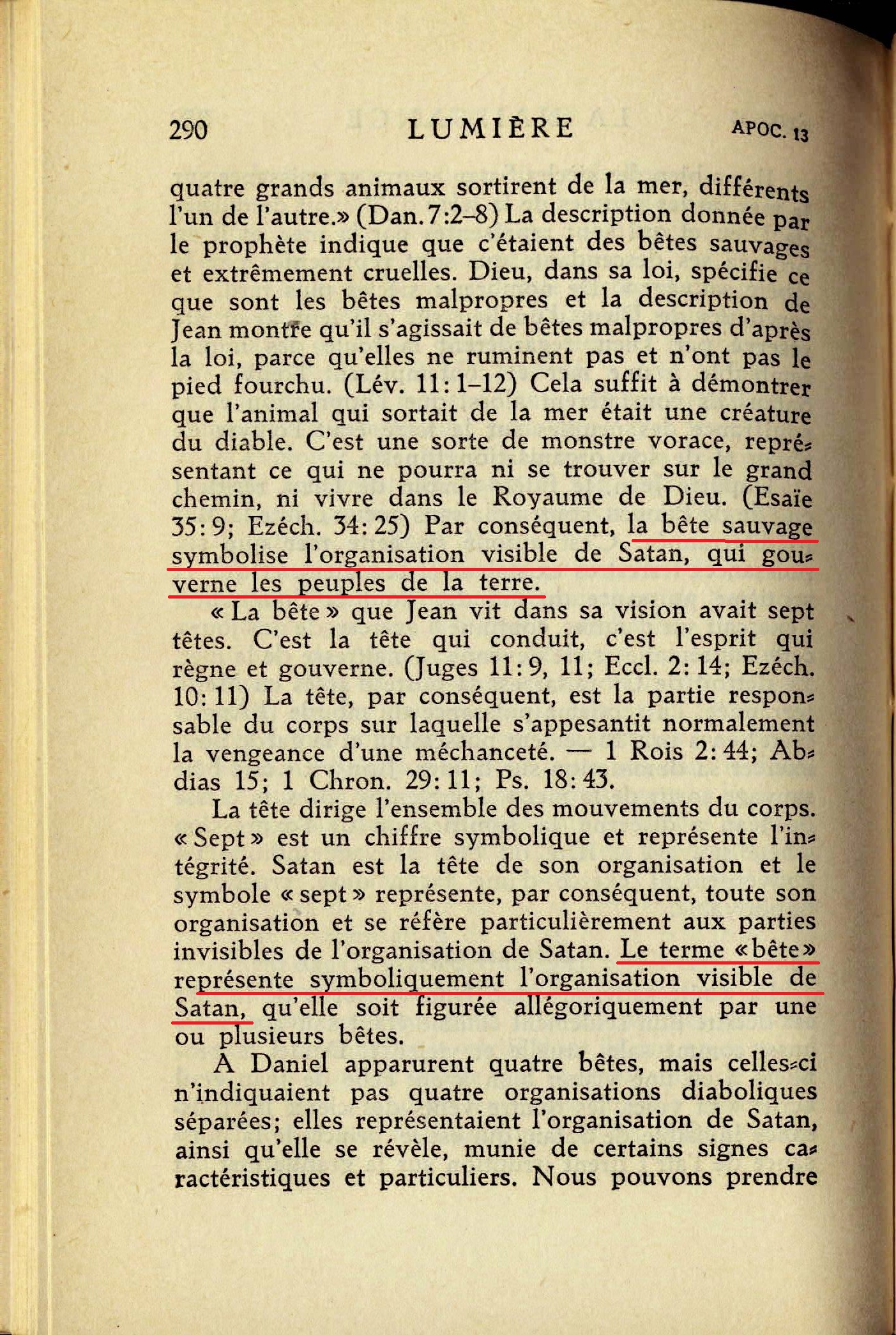 La "bête sauvage" que Jean vit sortir de la mer est décrite non seulement comme étant sauvage, mais aussi comme sale, cruelle et vicieuse [...] Cela suffit à démontrer que l'animal qui sortait de la mer était une créature du diable. C'est une sorte de monstre vorace, représentant ce qui ne pourra ni se trouver sur le grand chemin, ni vivre dans le Royaume de Dieu. (Esaïe 35:9; Ezech. 34:25) Par conséquent, la bête sauvage symbolise l'organisation visible de Satan, qui gouverne les peuples de la terre [...] Le terme "bête" représente symboliquement l'organisation visible de Satan, quelle soit figurée allégoriquement par une ou plusieurs bêtes [...] Nous pouvons prendre pour règle absolue que le terme "bêtes sauvages" représente toujours cette partie de l'organisation de Satan qui se trouve sur la terre. Le nombre "sept" paraît également se rapporter à sept puissances différentes dont chacune a occupé, à un certain moment, une position éminente dans le monde, mais qui toutes ont été placées sous la coupe de Satan, comme maître invisible. Source : 🇫🇷 1930 - Lumière, Vol 1, page 289, page 290, page 291 + Cover |