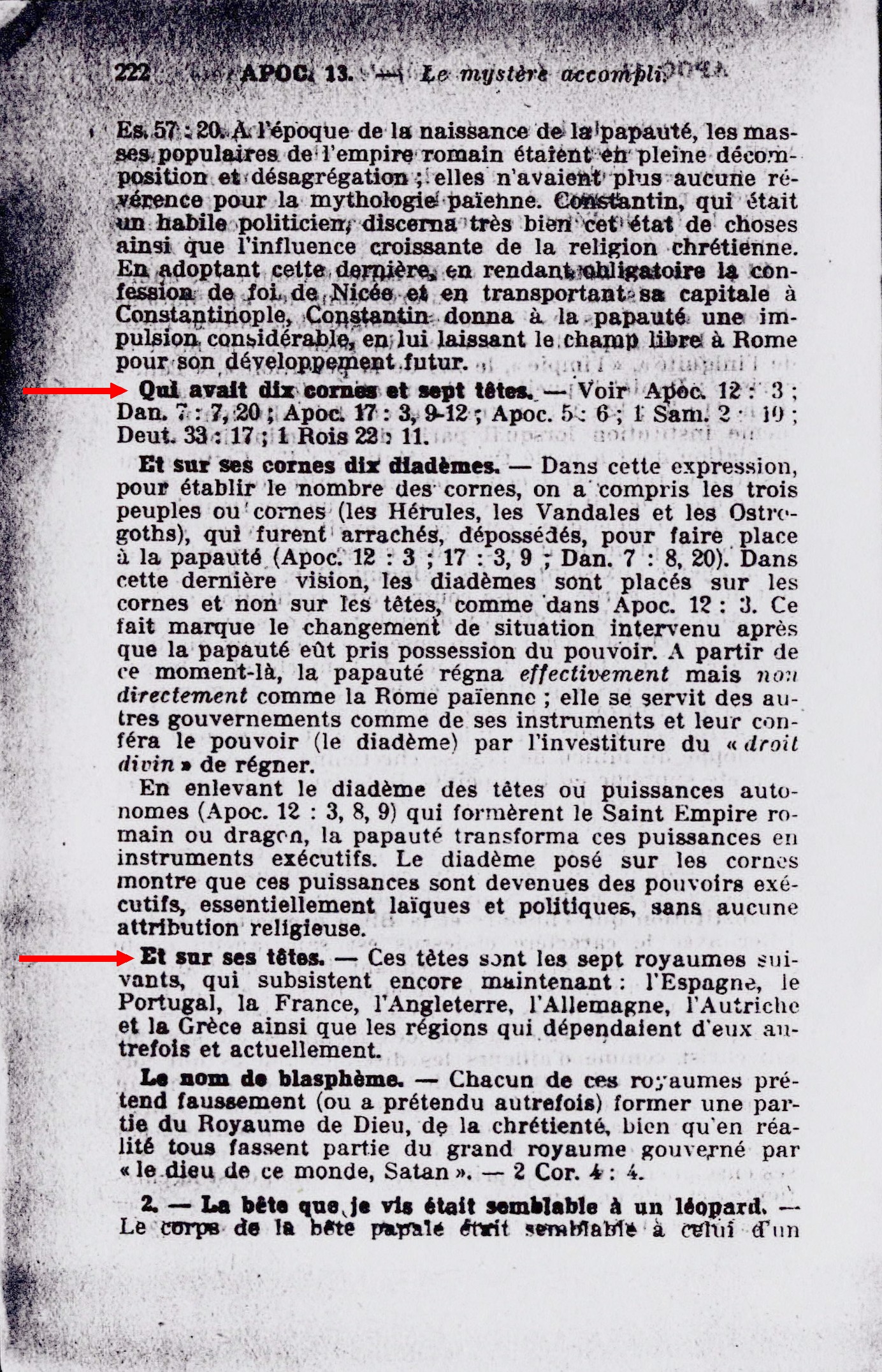 Qui avait dix cornes et sept têtes. - [...] Et sur ces têtes. - Ces têtes sont les sept royaumes suivants, qui subsistent encore maintenant : l'Espagne, le Portugal, la France, l'Angleterre, l'Allemagne, l'Autriche et la Grèce ainsi que les régions qui dépendaient d'eux autrefois et actuellement. Source : 🇫🇷 1917 - Le Mystere Accompli, page 222 + Cover |