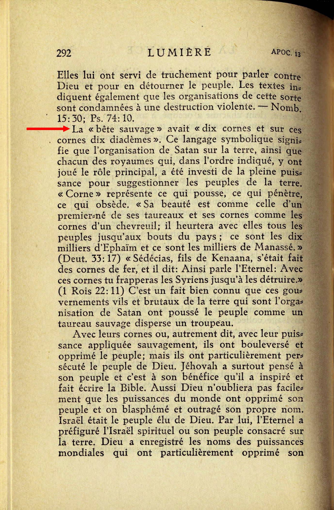 La "bête sauvage" avait "dix cornes et sur ces cornes dix diadèmes", Ce langage symbolique signifie que l'organisation de Satan sur la terre, ainsi que chacun des royaumes qui, dans l'ordre indiqué, y ont joué le rôle principal, a été investi de la pleine puissance pour suggestionner les peuples de la terre. [...] C'est un fait bien connu que ces gouvernements vils et brutaux de la terre qui sont l'organisation de Satan ont poussé le peuple comme un taureau sauvage disperse un troupeau.