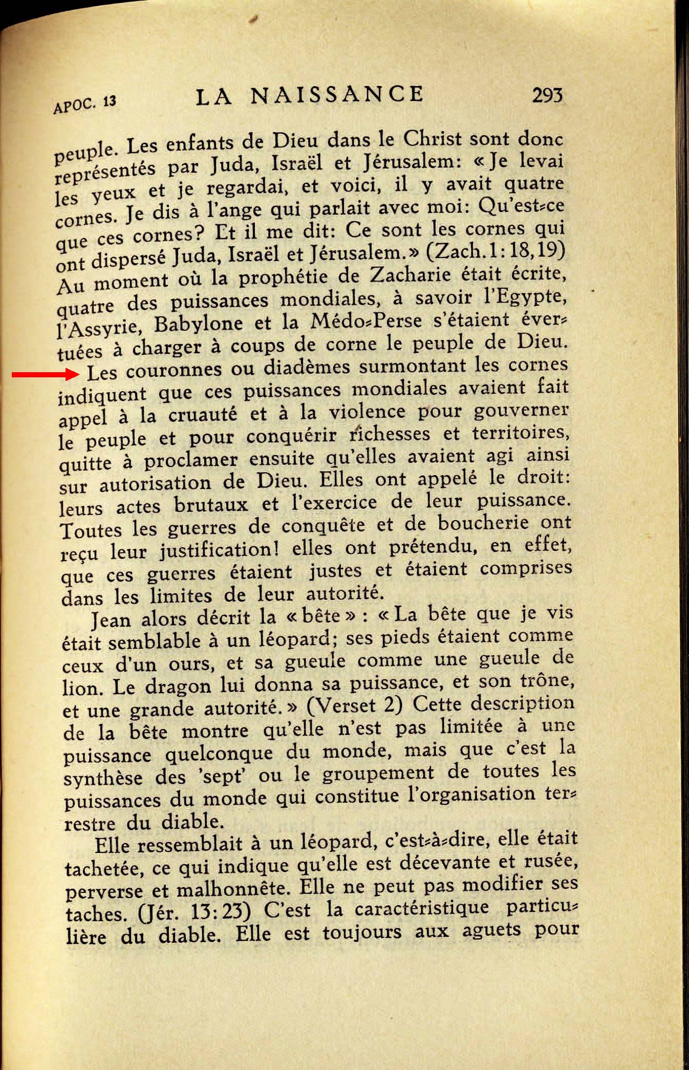 Avec leurs cornes ou, autrement dit, avec leur puissance appliquée sauvagement, ils ont bouleversé et opprimé le peuple; mais ils ont particulièrement persécuté le peuple de Dieu. [...] Les couronnes ou diadèmes surmontant les cornes indiquent que ces puissances mondiales avaient fait appel à la cruauté et à la violence pour gouverner le peuple et pour conquérir richesses et territoires, quitte à proclamer ensuite qu'elles avaient agi ainsi sur autorisation de Dieu. Elles ont appelé le droit: leurs actes brutaux et l'exercice de leur puissance. Toutes les guerres de conquête et de boucherie ont reçu leur justification! elles ont prétendu, en effet, que ces guerres étaient justes et étaient comprises dans les limites de leur autorité. Source : 🇫🇷 1930 - Lumière, Vol 1, page 292, page 293 + Cover |