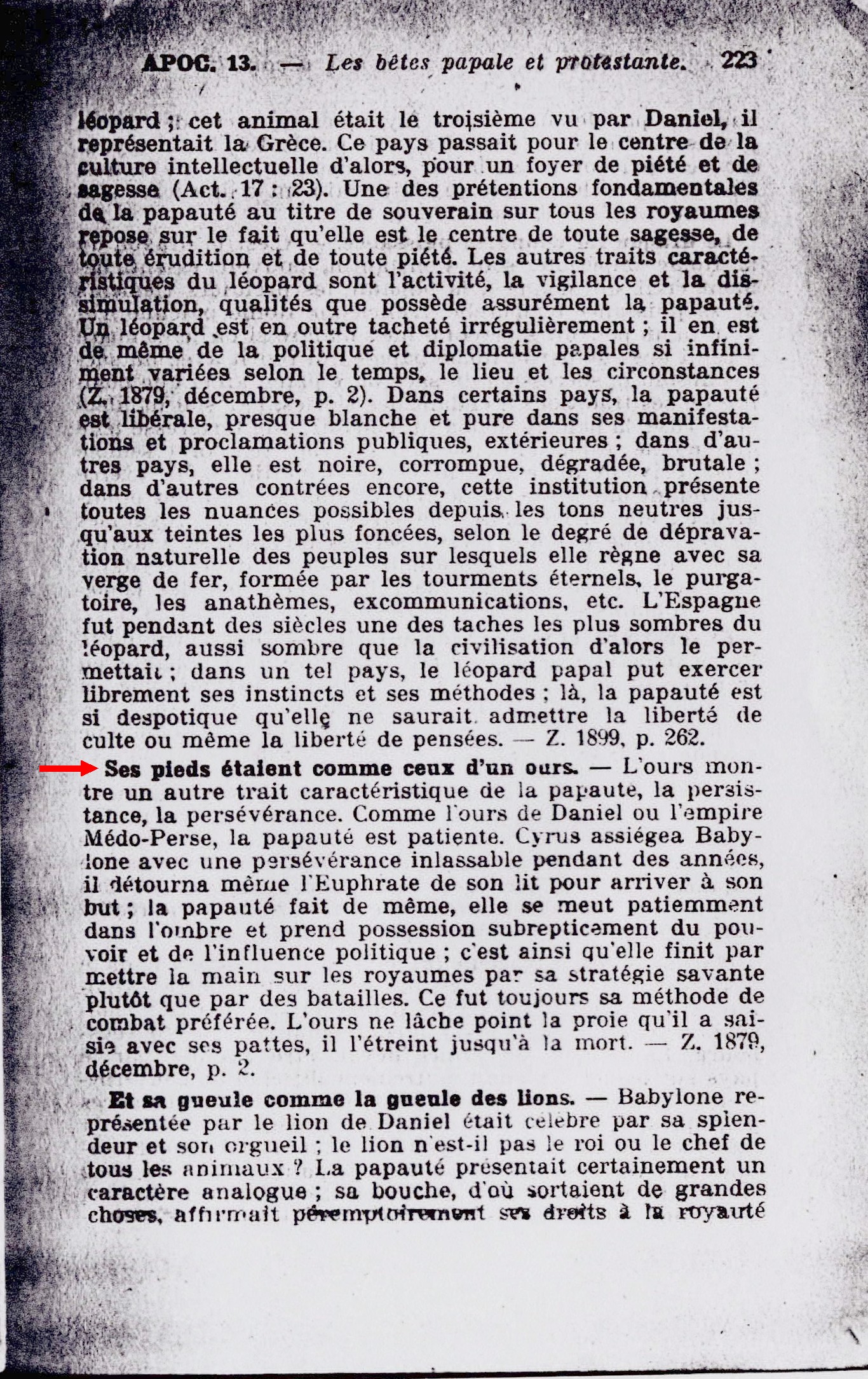 Ses pieds étaient comme ceux d'un ours. - L'ours montre un autre trait caractéristique de la papauté, la persistance, la persévérance. Comme l'ours de Daniel ou l'empire Médo-perse, la papauté est patiente. Cyrus assiégea Babylone avec une persévérance inlassable pendant des années, il détourna même l'Euphrate de son lit pour arriver à son but ; la papauté fait de même, elle meut patiemment dans l'ombre et prend possession subrepticement du pouvoir et de l'influence politique ; c'est ainsi qu'elle finit par mettre la main sur les royaumes par sa stratégie savante plutôt que par des batailles. ce fut toujours sa méthode de combat préférée. l'ours ne lâche point la proie qu'il a saisie avec ses pattes, il l'étreint jusqu'à la mort. - Z. 1879, décembre, p.2. Source : 🇫🇷 1917 - Le Mystere Accompli, page 223 + Cover |