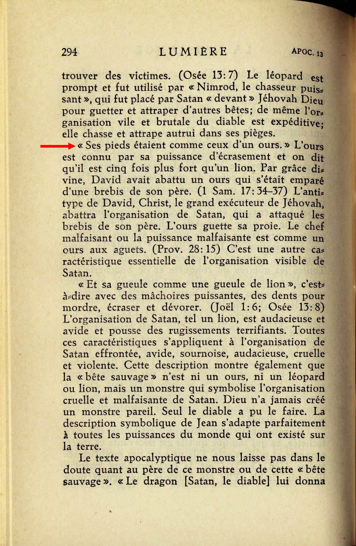 "ses pieds étaient comme ceux d'un ours." L'ours est connu par sa puissance d'écrasement et on dit qu'il est cinq fois plus fort qu'un lion. Par grâce divine, David avait abattu un ours qui s'était emparé d'une brebis de son père. (1 Sam. 17:34-37) L'anti-type de David, Christ, le grand exécuteur de Jéhovah, abattra l'organisation de Satan, qui a attaqué les brebis de son père. L'ours guette sa proie. Le chef malfaisant ou la puissance malfaisante est comme un ours aux aguets. (Prov. 28:15) C'est une autre caractéristique essentielle de l'organisation visible de Satan.
