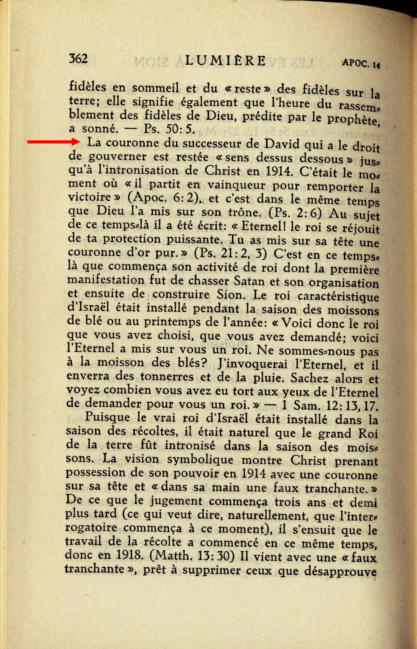 La couronne du successeur de David qui a le droit de gouverner est restée "sens dessus dessous" jusqu'à l'intronisation de Christ en 1914. La vision symbolique montre Christ prenant possession de son pouvoir en 1914 avec une couronne sur sa tête et "dans sa main un faux tranchante.
