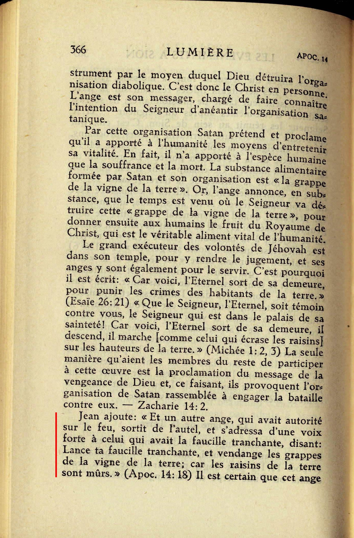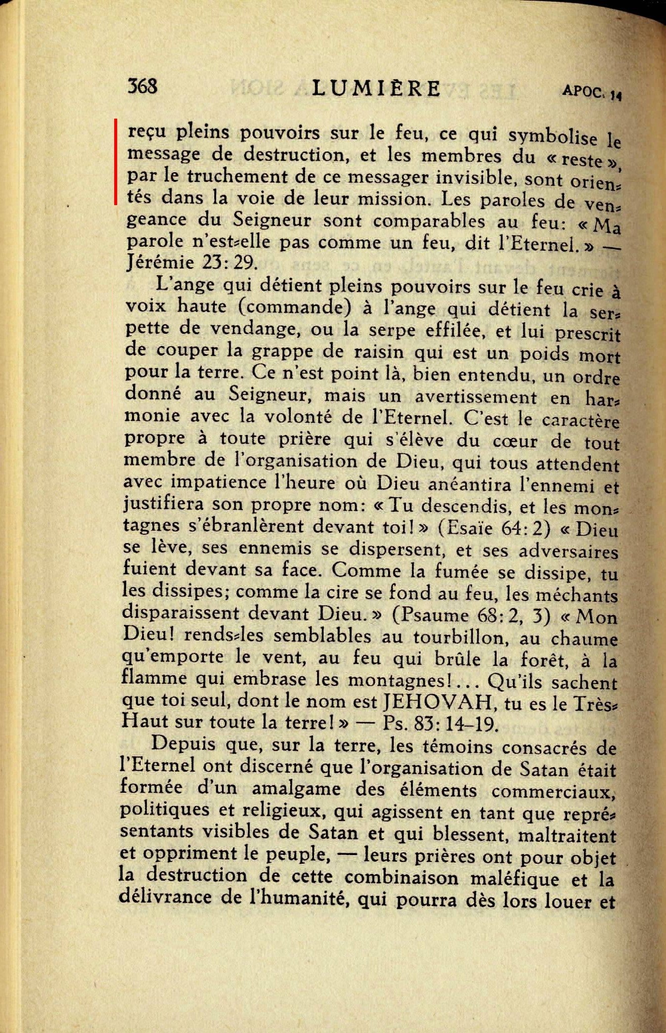 Jean ajoute: "Et un autre ange, qui avait autorité sur le feu, sortit de l'autel, et s'adressa d'une voix forte à celui qui avait la faucille tranchante, disant: Lance ta faucille tranchante, et vendange les grappes de la vigne de la terre; car les raisins de la terre sont mûrs." (Apoc. 14:18) Il est certain que cet ange du Seigneur était revêtu de l'autorité nécessaire et était soumis au devoir de lancer le message enflammé de la vengeance divine que ses oints ont mission de répandre sur la terre [...] L'ange du seigneur est chargé de la direction de ce service. Que ceux qui sont sur terre sachent ou non comment ce service est dirigé ne joue pas de rôle. Chaque élément de l'organisation divine doit y participer en quelque chose. [...] L'ange du Seigneur qui est consacré à cette tâche, a reçu pleins pouvoirs sur le feu, ce qui symbolise le message de destruction, et les membres du "reste", par le truchement de ce messager invisible, sont orientés dans la voie de leur mission.