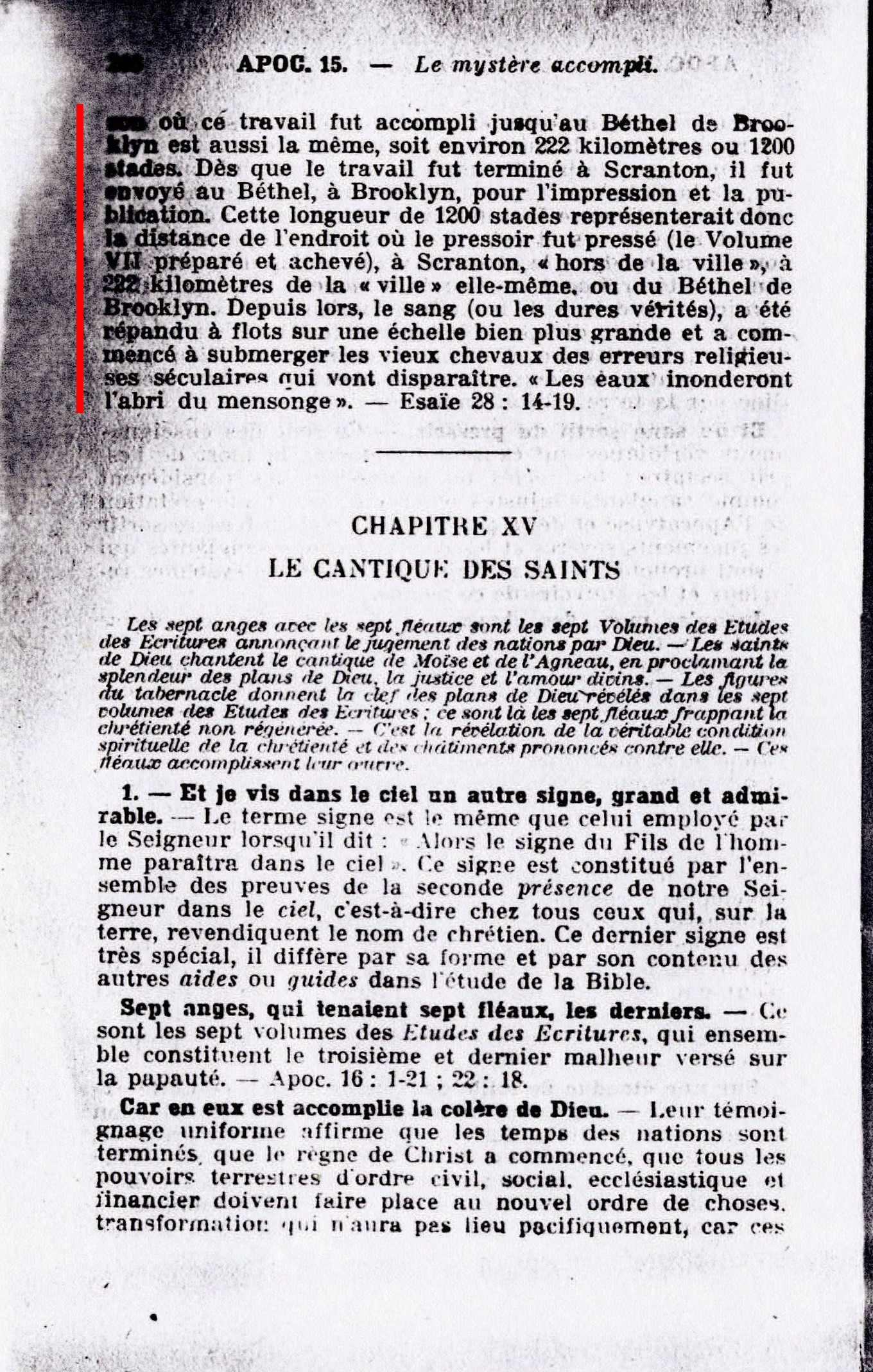 Sur une étendue de mille deux cents stades. - Cette expression ne saurait être en aucune manière une allusion au gigantesque front de bataille des armées en présence, car sa longueur totale dépasse 3000 kilomètres. Le stade vaut environ 185 mètres; ainsi 1200 stades valent sensiblement 222 kilomètres. Le présent ouvrage fut composé à Scranton (Pensylvanie). La distance exacte depuis la maison où ce travail fut accompli jusqu'au Béthel de Brooklyn est aussi la même, soit 222 kilomètres ou 1200 stades. Dès que le travail fut terminé à Scranton, il fut envoyé au Béthel, à Brooklyn, pour l'impression et la publication. Cette longueur de 1200 stades représenterait donc la distance de l'endroit où le pressoir fut pressé (le Volume VII préparé et achevé), à Scranton, "hors de la ville", à 222 kilomètres de la "ville" elle-même, ou du Béthel de Brooklyn. Source : 🇫🇷 1917 - Le Mystere Accompli, page 267, page 268 + Cover |