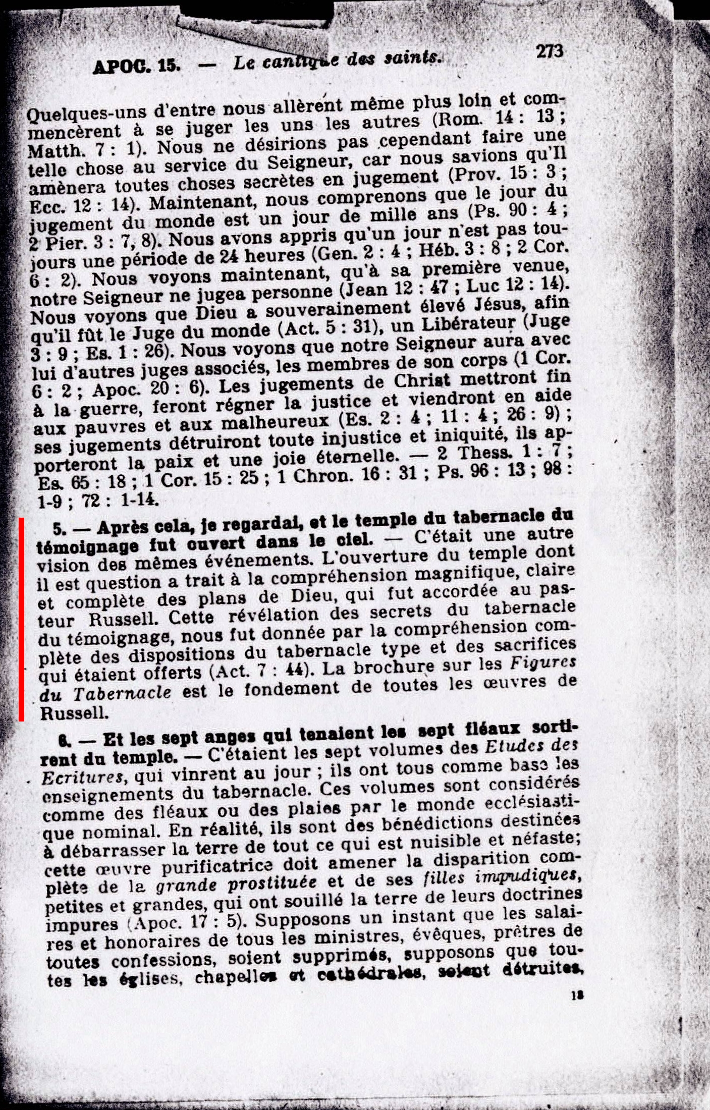 5. - Après cela, je regardai, et le temple du tabernacle du témoignage fut ouvert dans le ciel. - C'était une autre vision des mêmes événements. L'ouverture du temple dont il est question a trait à la compréhension magnifique, claire et complète des plans de Dieu, qui fut accordée au pasteur Russell. Cette révélation des secrets du tabernacle du témoignage, nous fut donnée par la compréhension complète des dispositions du tabernacle (Act. 7:44). La brochure sur les Figures du Tabernacle est le fondement de toutes les oeuvres de Russell. Source : 🇫🇷 1917 - Le Mystere Accompli, page 273 + Cover |