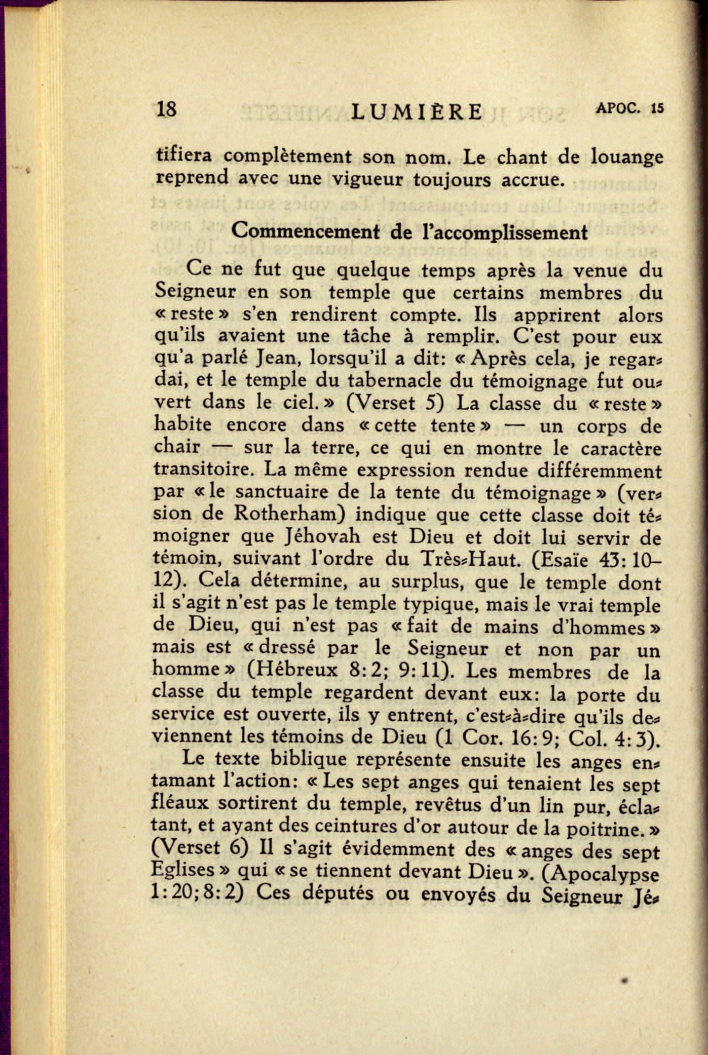 Ce ne fut que quelque temps après la venue du seigneur en son temple que certains membres du "reste" s'en rendirent compte. ils apprirent alors qu'ils avaient une tâche à remplir. C'est pour eux qu'à parlé Jean, lorsqu'il a dit: "Après cela regardai, et le temple du tabernacle du témoignage fut ouvert dans le ciel." (Verset 5) La classe du "reste" habite encore dans "cette tente" - un corps de chair - sur la terre, ce qui en montre le caractère transitoire. La même expression rendue différemment par "le sanctuaire de la tente du témoignage" (version de Rotherham) indique que cette classe doit témoigner que Jéhovah est Dieu et doit lui servir de témoin, suivant l'ordre du Très-Haut. (Esaïe 43:10-12). Cela détermine, au surplus, que le temple dont il s'agit n'est pas le temple typique, mais le vrai temple de Dieu, qui n'est pas "fait de mains d'hommes" mais est "dressé par le seigneur et non par un homme" (Hébreux 8:2; 9:11). Les membres de la classe du temple regardent devant eux: la porte du service est ouverte, ils y entrent, c'est-à-dire qu'ils deviennent les témoins de Dieu (1 Cor. 16:9; Col 4:3).