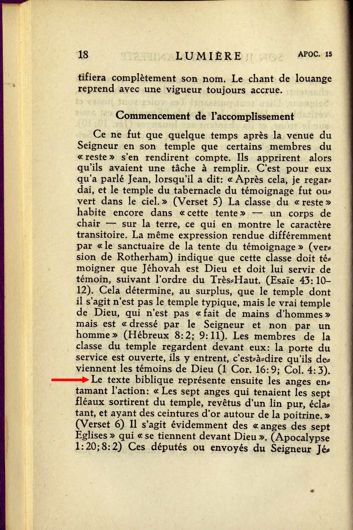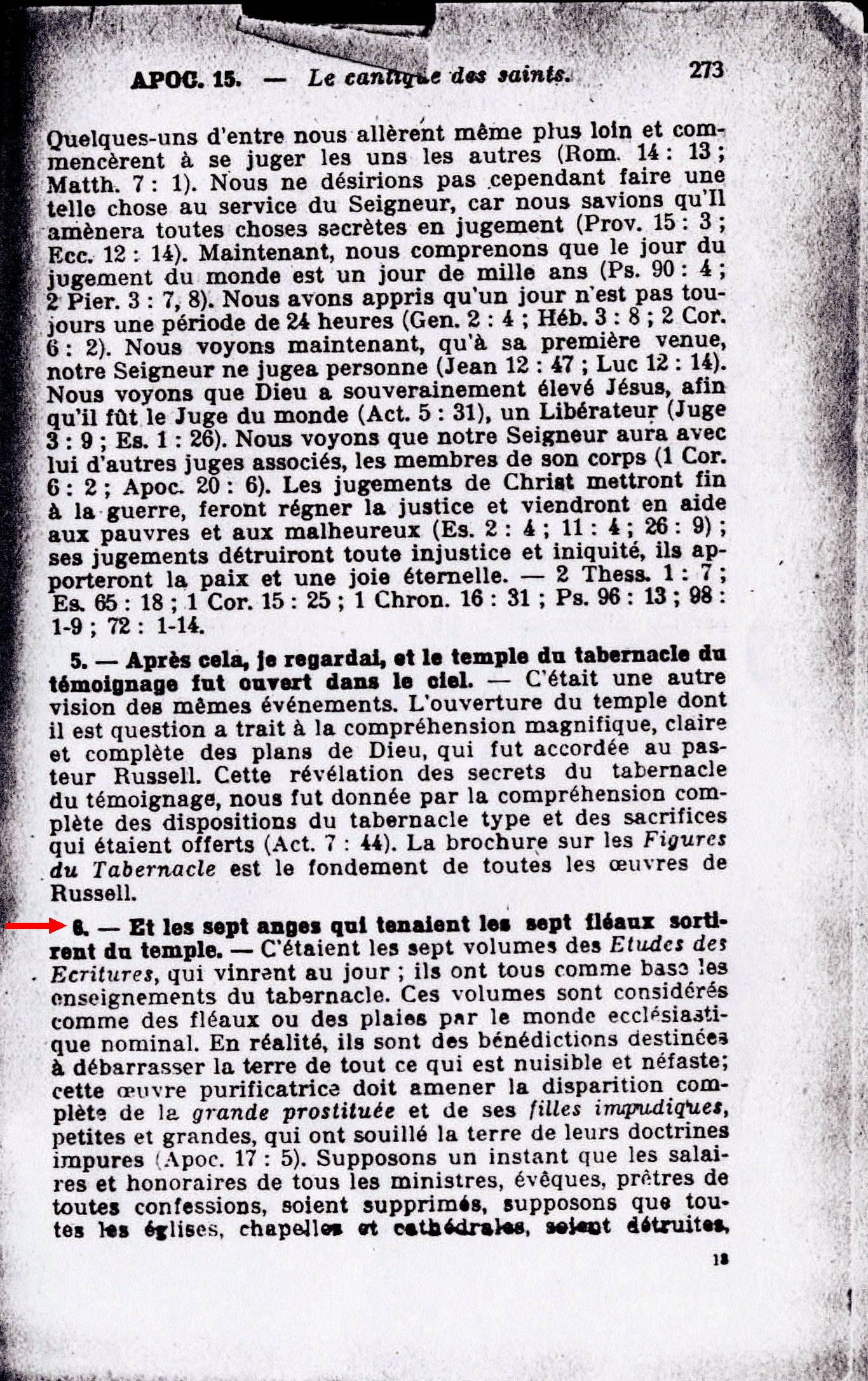 6. - Et les sept anges qui tenaient les sept fléaux sortirent du temple. - C'étaient les sept volumes des Études des Écritures, qui vinrent au jour; ils ont tous comme base les enseignements du tabernacle. Ces volumes sont considérés comme des fléaux ou des plaies par le monde ecclésiastique nominal. En réalité, ils sont des bénédictions destinées à débarrasser la terre de tout ce qui est nuisible et néfaste; Source : 🇫🇷 1917 - Le Mystere Accompli, page 273 + Cover |