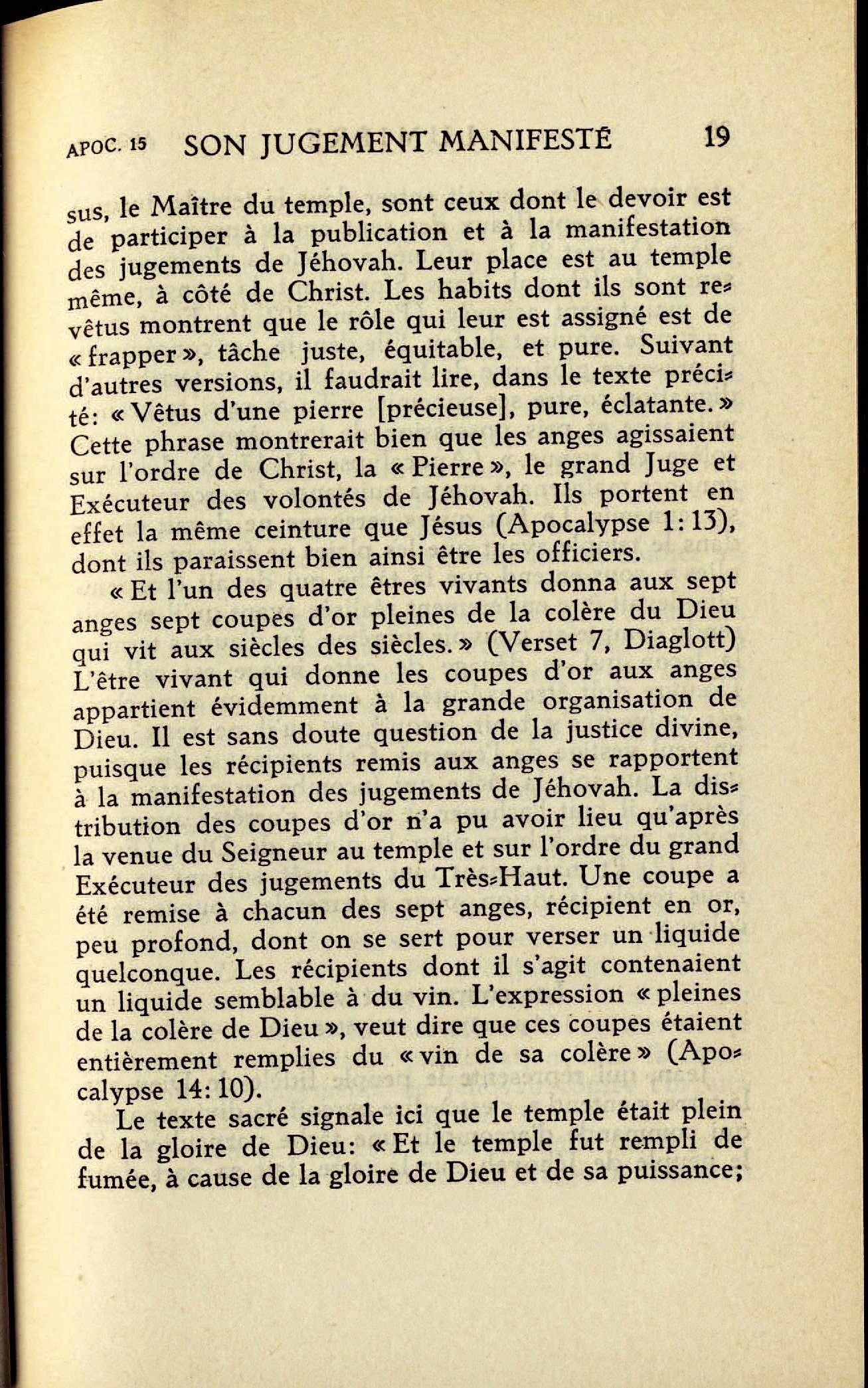 Le texte biblique représente ensuite les anges entamant l'action: "Les sept anges qui tenaient les sept fléaux sortirent du temple, revêtus d'un lin pur, éclatant, et ayant des ceintures d'or autour de la poitrine.". (Verset 6) Il s'agit évidemment des "anges des sept Eglises" qui "se tiennent devant Dieu". (Apocalypse 1:20; 8:2) Ces députés ou envoyés du Seigneur Jésus, le Maître du temple, sont ceux dont le devoir est de participer à la publication et à la manifestation des jugements de Jéhovah. Source : 🇫🇷 1930 - Lumière, Vol 2, page 18, page 19 + Cover |