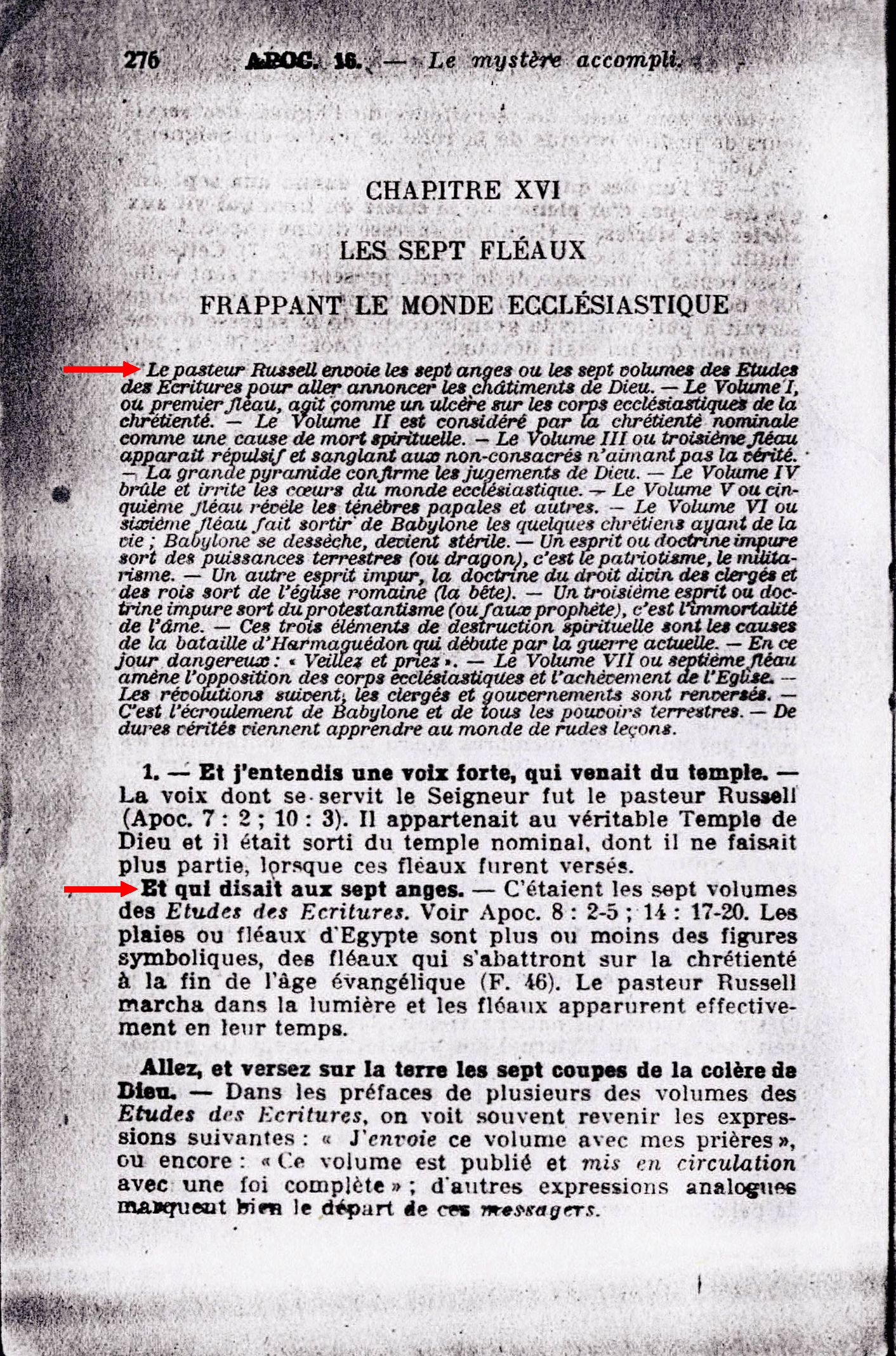 Le pasteur Russell envoie les sept anges ou les sept volumes des Études des Écritures pour aller annoncer le châtiment de Dieu [...] Et qui disait aux sept anges. - C'étaient les sept volumes des Études des Écritures. Voir Apoc. 8:2-5; 14:17-20. Les plaies ou fléaux d’Égypte sont plus ou moins des figures symboliques, des fléaux qui s'abattront sur la chrétienté à la fin de l'âge évangélique (F.46). Le pasteur Russell marcha dans la lumière et les fléaux apparurent effectivement en leur temps. Source : 🇫🇷 1917 - Le Mystere Accompli, page 276 + Cover |