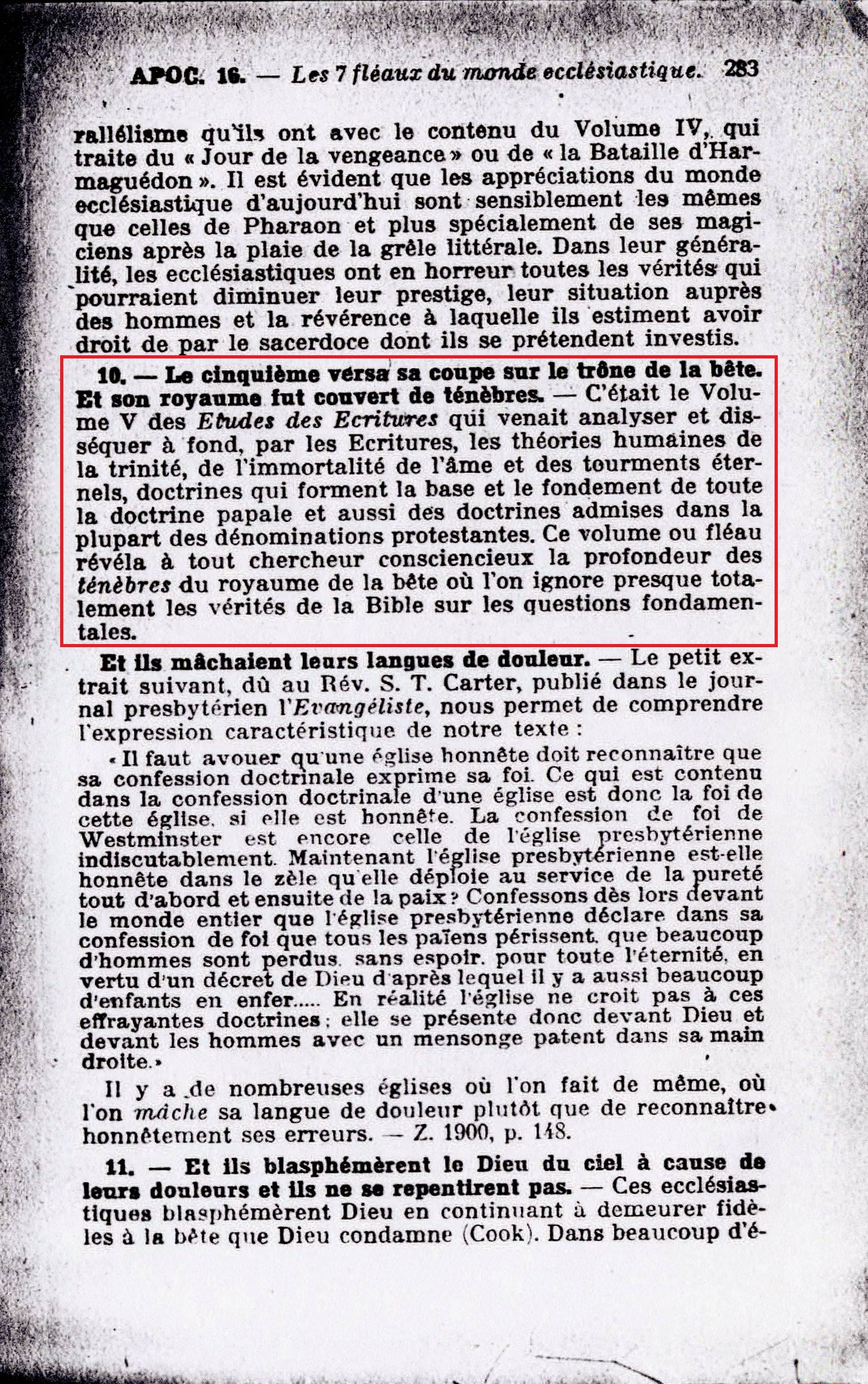 10. - Le cinquième versa sa coupe sur le trône de la bête. Et son royaume fut couvert de ténèbres. - C'était le Volume V des Etudes des Ecritures qui venait analyser et disséquer à fond, par les Ecritures, les théories humaines de la trinité, de l'immortalité de l'âme et des tourments éternels, doctrines qui forment la base et le fondement de toute la doctrine papale et aussi des doctrines admises dans la plupart des dénominations protestantes. Ce volume ou fléau révéla à tout chercheur consciencieux la profondeur des ténèbres du royaume de la bête où l'on ignore presque totalement les vérités de la Bible sur les question fondamentales. Source : 🇫🇷 1917 - Le Mystere Accompli, page 283 + Cover |