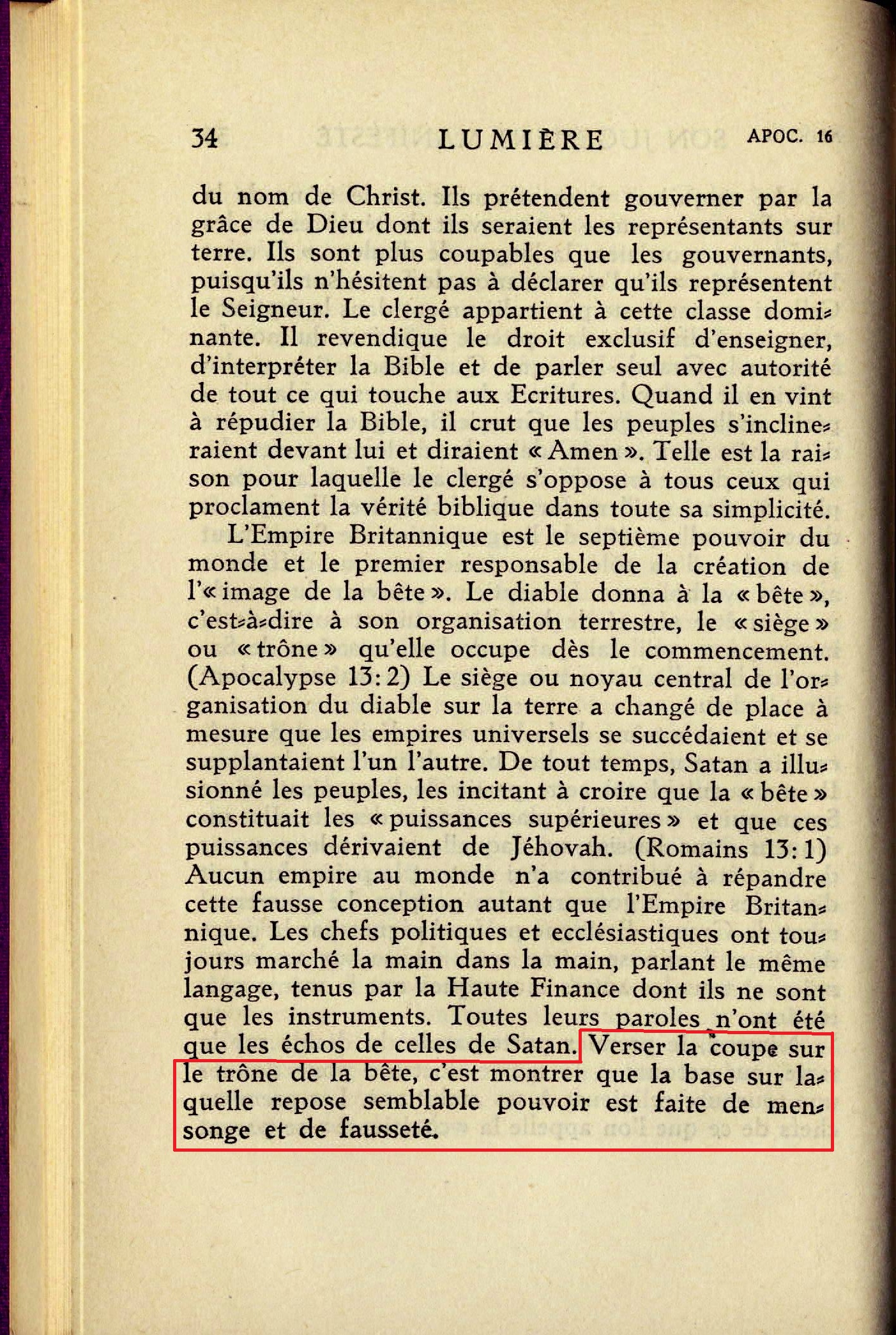 "Le cinquième versa sa coupe sur le trône de la bête. Et son royaume fut couvert de ténèbres; et les hommes se mordaient la langue de douleur." (Verset 10) [...] La "bête" est l'organisation de Satan sur la terre [...] Les mots "trône de la bête" ne désigne pas nécessairement un certain lieu bien délimité sur la terre. Ils marquent plutôt cette partie de l'organisation de Satan qui y occupe la place prépondérante. Ils indiquent donc l'assise sur laquelle repose le pouvoir de la "bête", et visent ainsi surtout le prétendu droit divin des rois à gouverner les peuples. [...] Le diable donna à la "bête", c'est-à-dire à son organisation terrestre, le "siège" ou "trône" qu'elle occupe dès le commencement [...] Le siège ou noyau central de l'organisation du diable sur la terre a changé de place à mesure que les empires universels se succédaient et se supplantaient l'un l'autre [...] Verser la coupe sur le trône de la bête, c'est montrer que la base sur laquelle repose semblable pouvoir est faite de mensonge et de fausseté. Source : 🇫🇷 1930 - Lumière, Vol 2, page 33, page 34 + Cover |