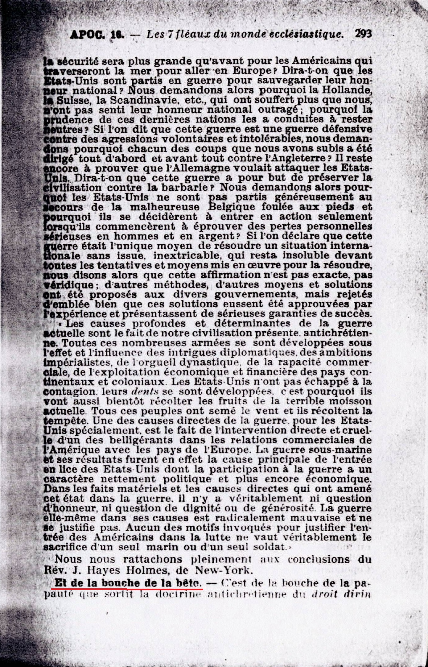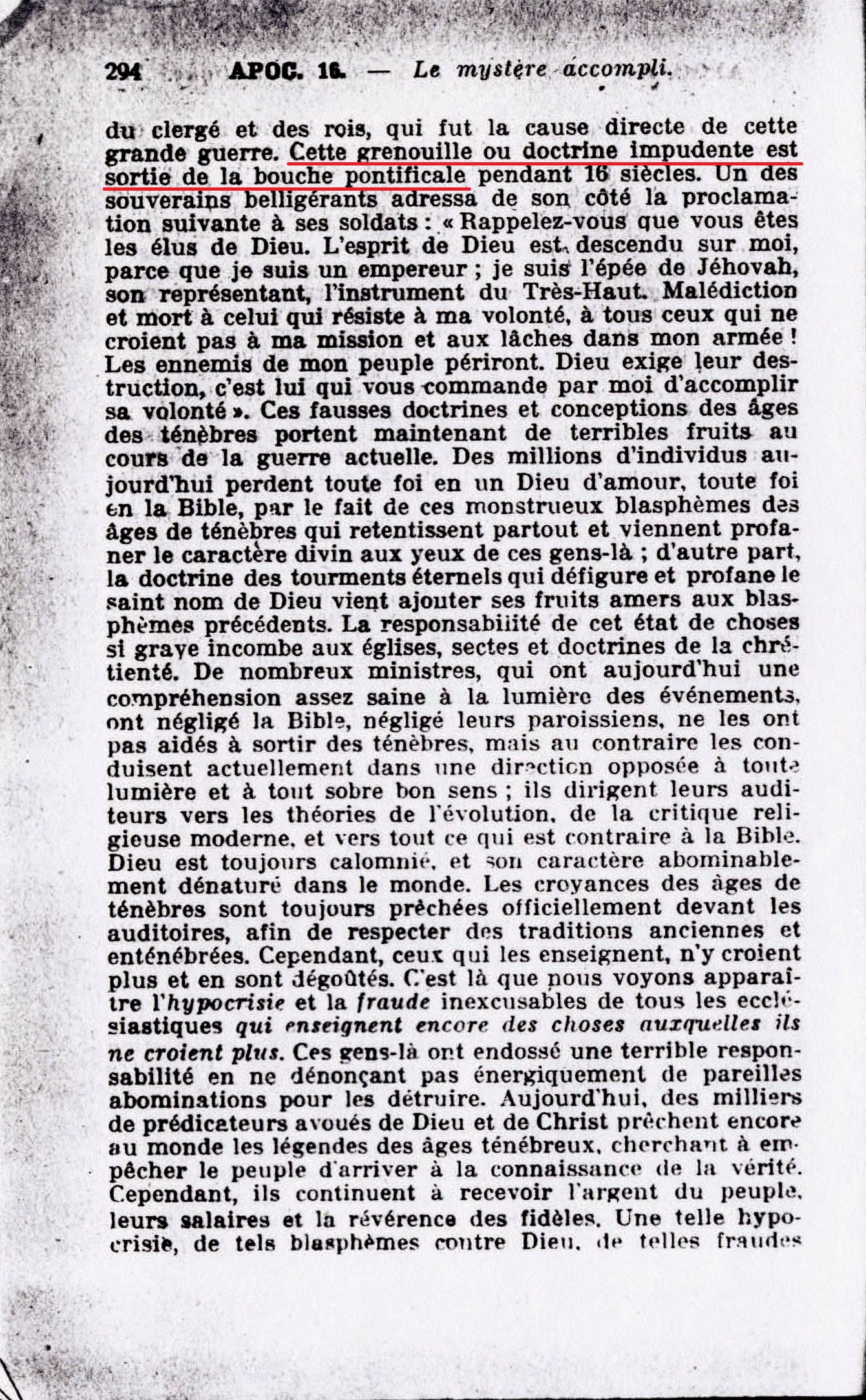 Et de la bouche de la bête. - C'est de la bouche de la papauté que sortit la doctrine antichrétienne du droit divin du clergé et des rois, qui fut la cause directe de cette grande guerre. Cette grenouille ou doctrine impudente est sortie de la bouche pontificale pendant 16 siècles. Source : 🇫🇷 1917 - Le Mystere Accompli, page 293, page 294 + Cover |