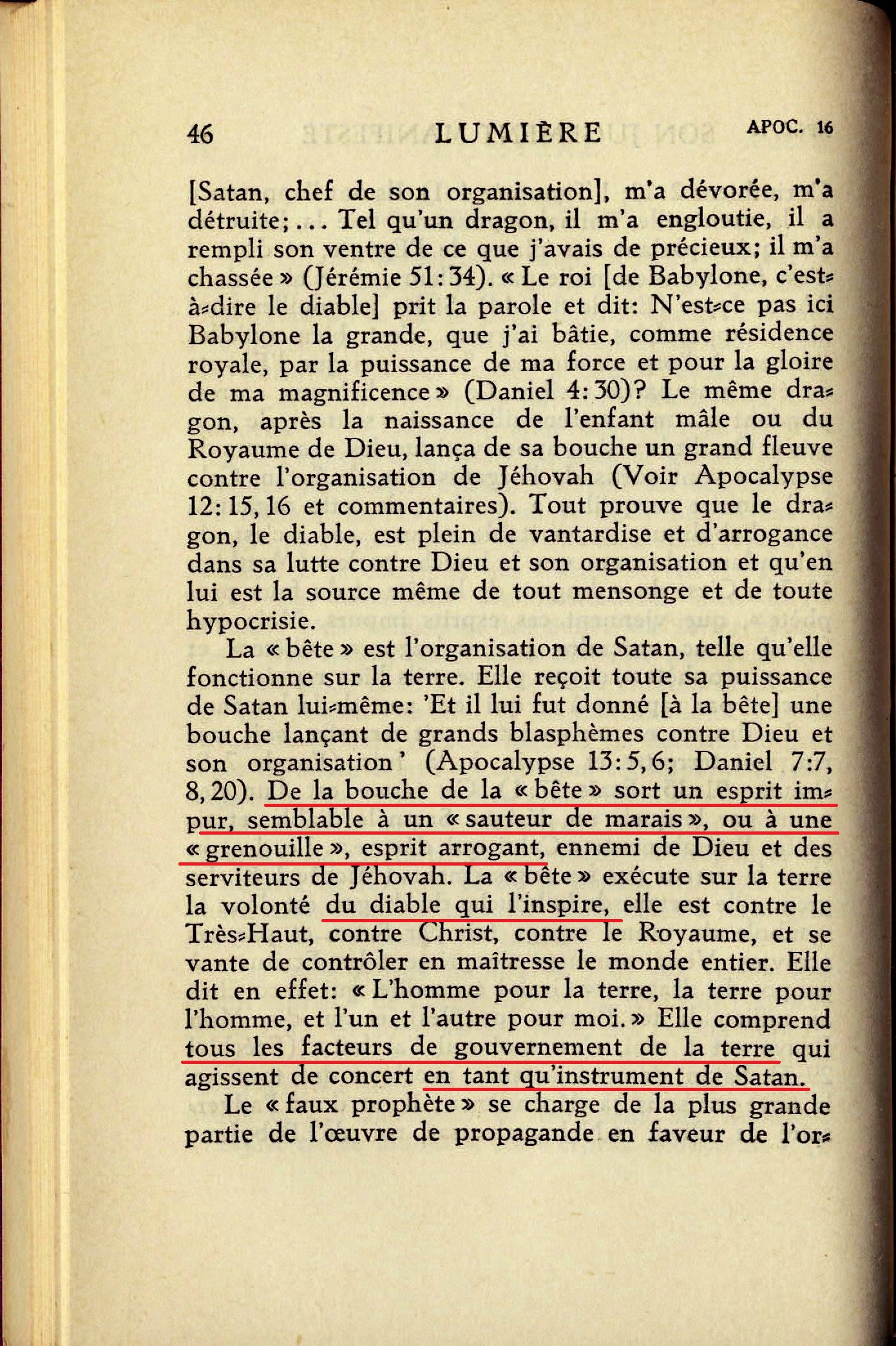 La "bête" est l'organisation de Satan, telle qu'elle fonctionne sur la terre. Elle reçoit toute sa puissance de Satan lui-même: 'Et il lui fut donné [à la bête] une bouche lançant de grands blasphèmes contre Dieu et son organisation' (Apocalypse 13:5, 6; Daniel 7:7, 8, 20). De la bouche de la "bête" sort un esprit impur, semblable à un "sauteur de marais", ou à une "grenouille", esprit arrogant, ennemi de Dieu et des serviteurs de Jéhovah. La "bête" exécute sur la terre la volonté du diable qui l'inspire, elle est contre le Très-Haut, contre Christ, contre le Royaume, et se vante de contrôler en maîtresse le monde entier. Elle dit en effet: "L'homme pour la terre, la terre pour l'homme, et l'un et l'autre pour moi." Elle comprend tous les facteurs de gouvernement de la terre qui agissent de concert en tant qu'instrument de Satan. Source : 🇫🇷 1930 - Lumière, Vol 2, page 46 + Cover |