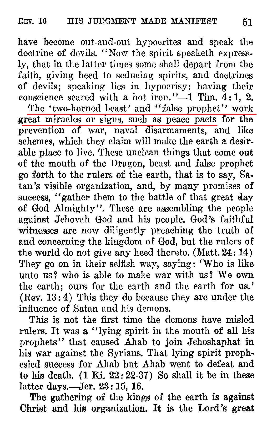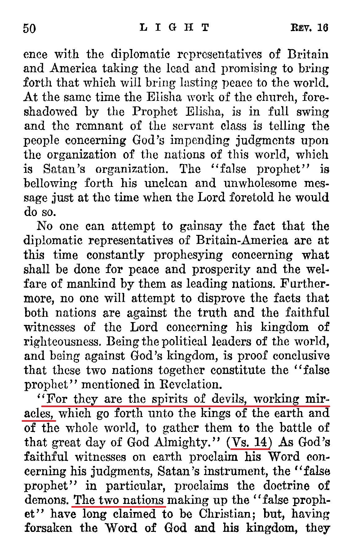 "For they are the spirits of devils, working miracles, which go forth unto the kings of the earth and of the whole world, to gather them to the battle of that great day of God Almighty." (Vs. 14) As God's faithful witnesses on earth proclaim his Word concerning his judgments, Satan's instrument, the "false prophet" in particular, proclaims the doctrine of demons. The two nations making up the "false prophet" have long claimed to be Christian; but, having forsaken the Word of God and his kingdom, they have become out-and-out hypocrites and speak the doctrine of devils. [...] The 'two-horned beast' and "false prophet" work great miracles or signs, such as peace pacts for the prevention of war, naval disarmaments, and like schemes, which they claim will make the earth a desirable place to live. These unclean things that come out of the mouth of the Dragon, beast and false prophet go forth to the rulers of the earth, that is to say, Satan's visible organization, and, by many promises of success, "gather them to the battle of that great Day of God Almighty". These are assembling the people against Jehovah God and his people. Source : 🇺🇸 1930 - Light, Vol 2, page 50, page 51 + Cover |