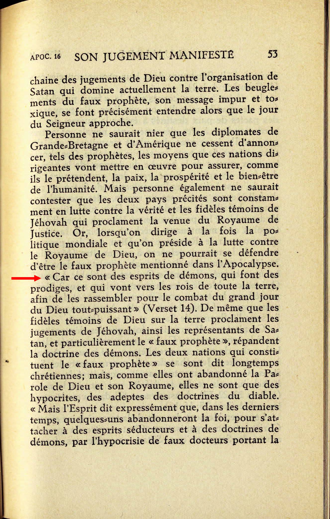 "Car ce sont des esprits de démons, qui font des prodiges, et qui vont vers les rois de toute la terre, afin de les rassembler pour le combat du grand jour du Dieu tout-puissant" (Verset 14). De même que les fidèles témoins de Dieu sur terre sur la terre proclament les jugements de Jéhovah, ainsi les représentants de Satan, et particulièrement le "faux prophète", répandent la doctrine des démons. Les deux nations qui constituent le "faux prophète" [Grande Bretagne + Amérique] se sont dit longtemps chrétiennes; mais, comme elles ont abandonné la parole de Dieu et son Royaume, elles ne sont que des hypocrites, des adeptes des doctrines du diable [...] La "bête à deux cornes" et le "faux prophète" font de grands miracles ou prodiges. Ils proposent des pactes de paix destinés à éviter la guerre, des accords tendant à des désarmements navals, et autres projets. Ils imaginent des plans grandioses qui devraient faire de la terre un séjour agréable. Ces choses impures, sorties de la bouche du dragon, de la bête et du faux prophète vont vers les gouverneurs du monde, c'est-à-dire vers l'organisation de Satan, et, par de fallacieuses promesses de succès, "les rassemblent pour la bataille du grand jour du Dieu tout-puissant". Source : 🇫🇷 1930 - Lumière, Vol 2, page 53, page 54 + Cover |