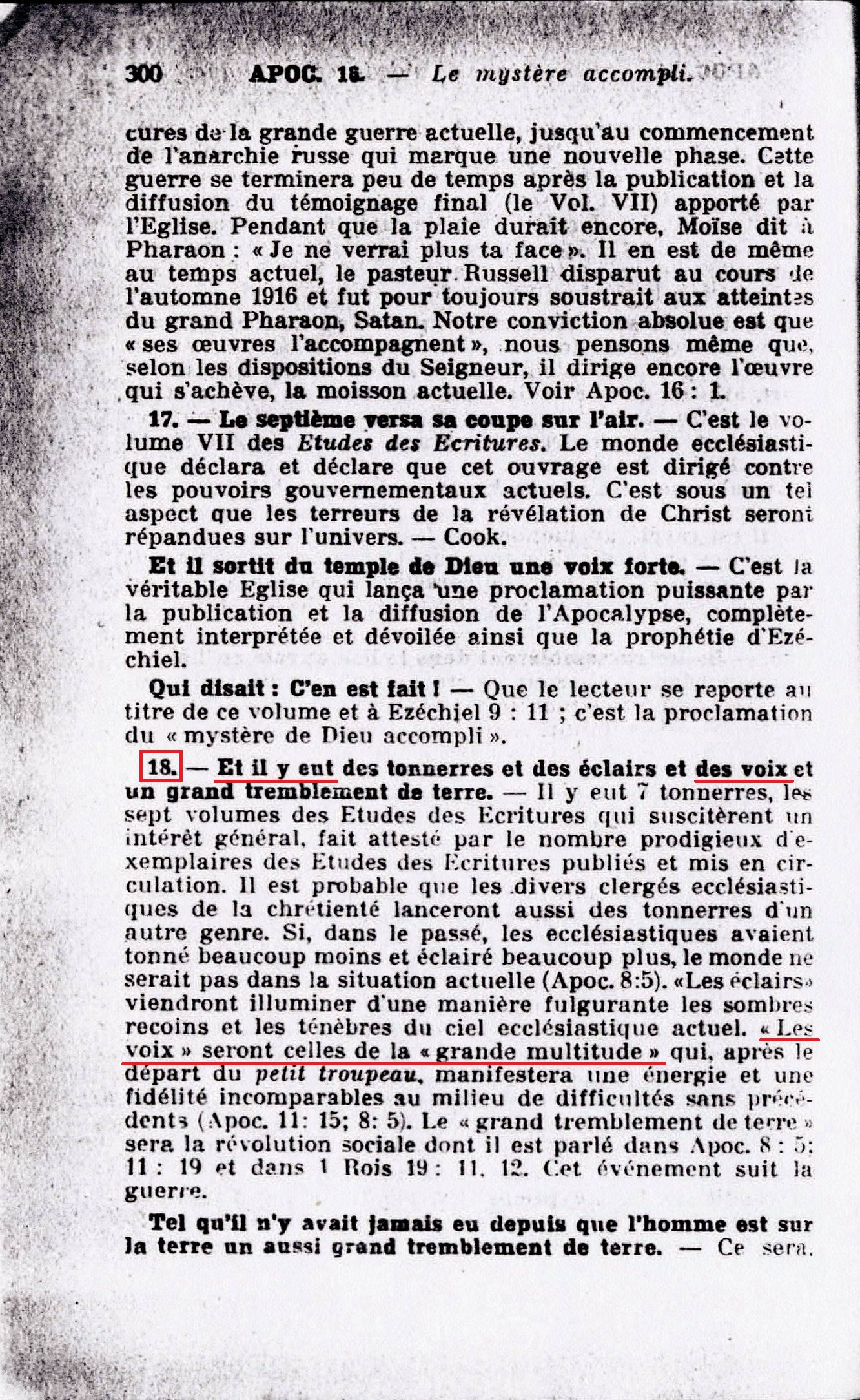 18 - Et il y eut des tonnerres et des éclairs et des voix et un grand tremblement de terre. - Il y eut 7 tonnerres, les sept volumes des Etudes des Ecritures qui suscitèrent un intérêt général, [...] Les voix" seront celles de la "grande multitude" qui, après le départ du petit troupeau, manifestera une énergie et une fidélité incomparables au milieu de difficultés sans précédents (Apoc. 11:15; 8:5). Source : 🇫🇷 1917 - Le Mystere Accompli, page 300 + Cover |