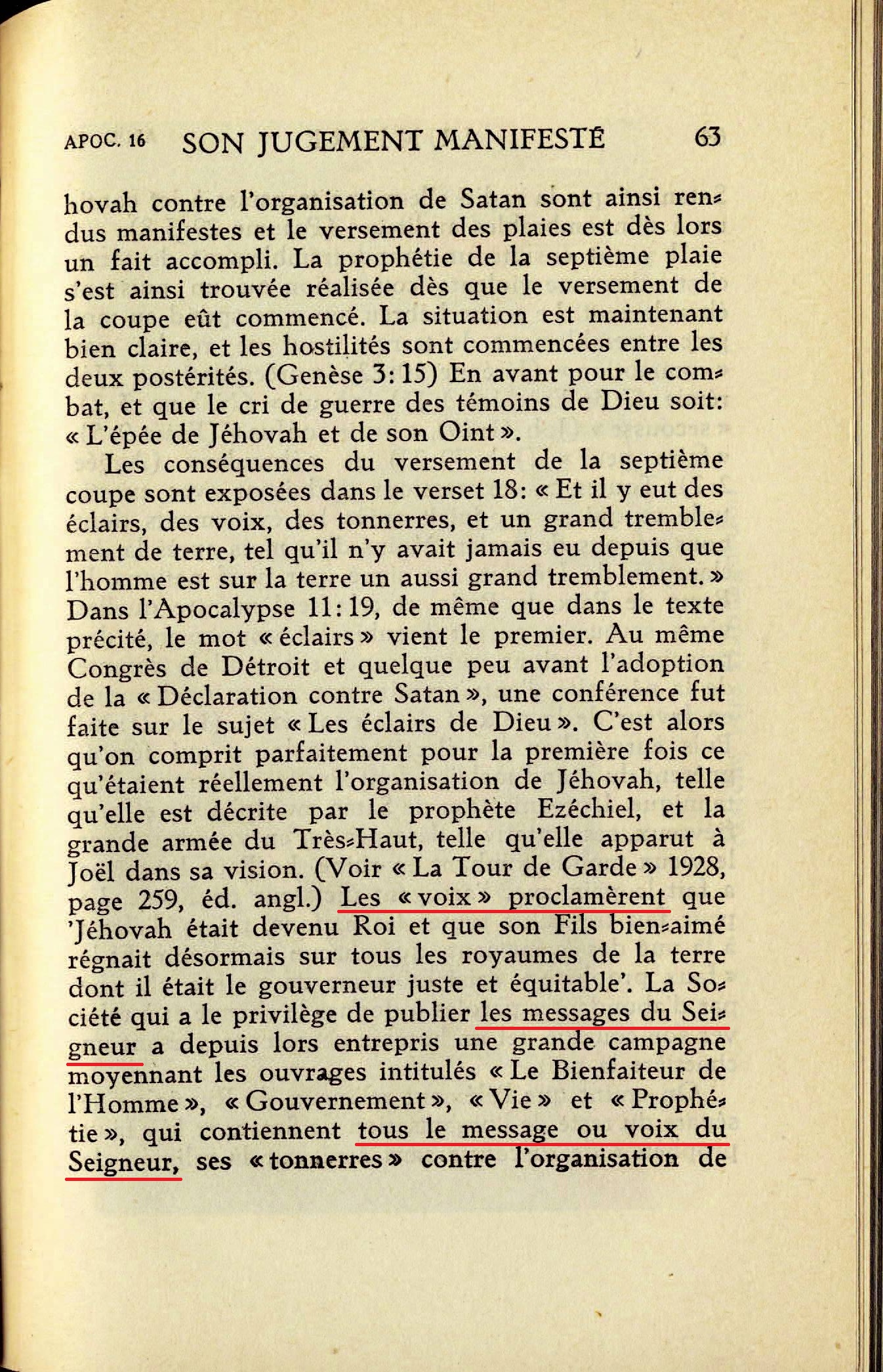 Les conséquences du versement de la septième coupe sont exposées dans le verset 18: "Et il y eut des éclairs, des voix, des tonnerres, et un grand tremblement de terre, tel qu'il n'y avait jamais eu depuis que l'homme est sur la terre un aussi grand tremblement." [...] Les "voix" proclamèrent que 'Jéhovah était devenu Roi et que son Fils bien-aimé régnait désormais sur tous les royaumes de la terre dont il était le gouverneur juste et équitable'. La Société qui a le privilège de publier les messages du Seigneur a depuis lors entrepris une grande campagne moyennant les ouvrages intitulés "Le Bienfaiteur de l'Homme", "Gouvernement", "Vie" et "Prophétie", qui contiennent tous le message ou voix du Seigneur, ses "tonnerres" contre l'organisation de Satan, [...] Source : 🇫🇷 1930 - Lumière, Vol 2, page 63 + Cover |
