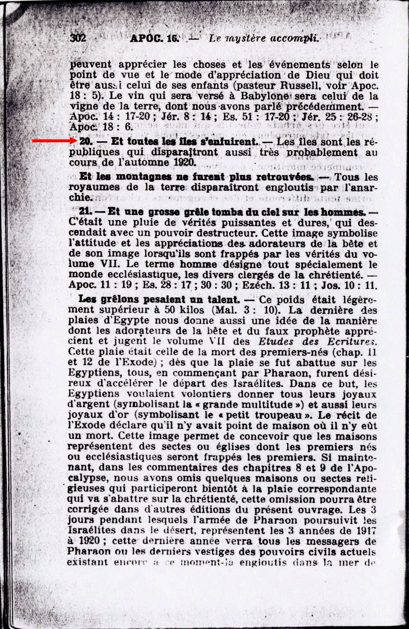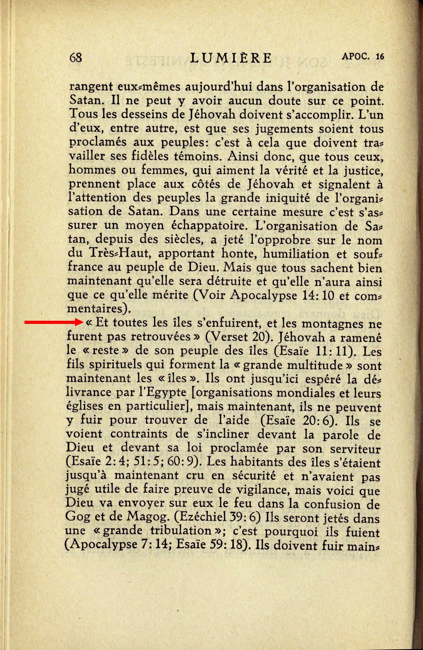 "Et toutes les îles s'enfuirent, et les montagnes ne furent pas retrouvés" (Verset 20). Jéhovah a ramené le "reste" de son peuple des îles (Esaïe 11:11). Les fils spirituels qui forment la "grande multitude" sont maintenant les "îles". Ils ont jusqu'ici espéré la délivrance par l'Egypte [organisations mondiales et leurs églises en particulier], mais maintenant, ils ne peuvent y fuir pour trouver de l'aide (Esaïe 20:6). Ils se voient contraints de s'incliner devant la Parole de Dieu et devant sa loi proclamée par son serviteur (Esaïe 2:4; 51:5; 60:09). Source : 🇫🇷 1930 - Lumière, Vol 2, page 68 + Cover |
