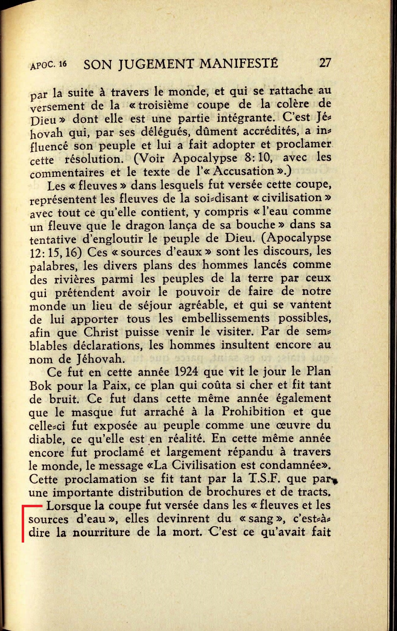 Lorsque la coupe fut versée dans les "fleuves et les sources d'eau", elles devinrent du "sang", c'est-à-dire la nourriture de la mort. C'est ce qu'avait fait naguère Jéhovah aux Egyptiens lorsqu'il "changea leurs fleuves en sang, et ils ne purent en boire les eaux". (Psaume 78:44) Ce fut à partir de ce moment que l'on accusa les représentants de la soi-disant civilisation comme responsables de l'effusion injuste du sang de millions de jeunes gens durant la Grande Guerre. Et l'on comprit que les peuples ne pouvaient absorber les conseil donnés par les représentants de Satan dans leurs discours, leurs conférences et leurs plans de toutes sortes, car ceux-ci étaient corrompus en teintés de sang. Les représentants de Satan avaient cruellement abreuvé la soi-disant "civilisation" de sang humain; c'est pourquoi il ne faudrait pas les entendre lorsqu'ils préconisent des remèdes qu'ils prétendent être pour le bien de l'humanité. Source : 🇫🇷 1930 - Lumière, Vol 2, page 27, page 28 + Cover |