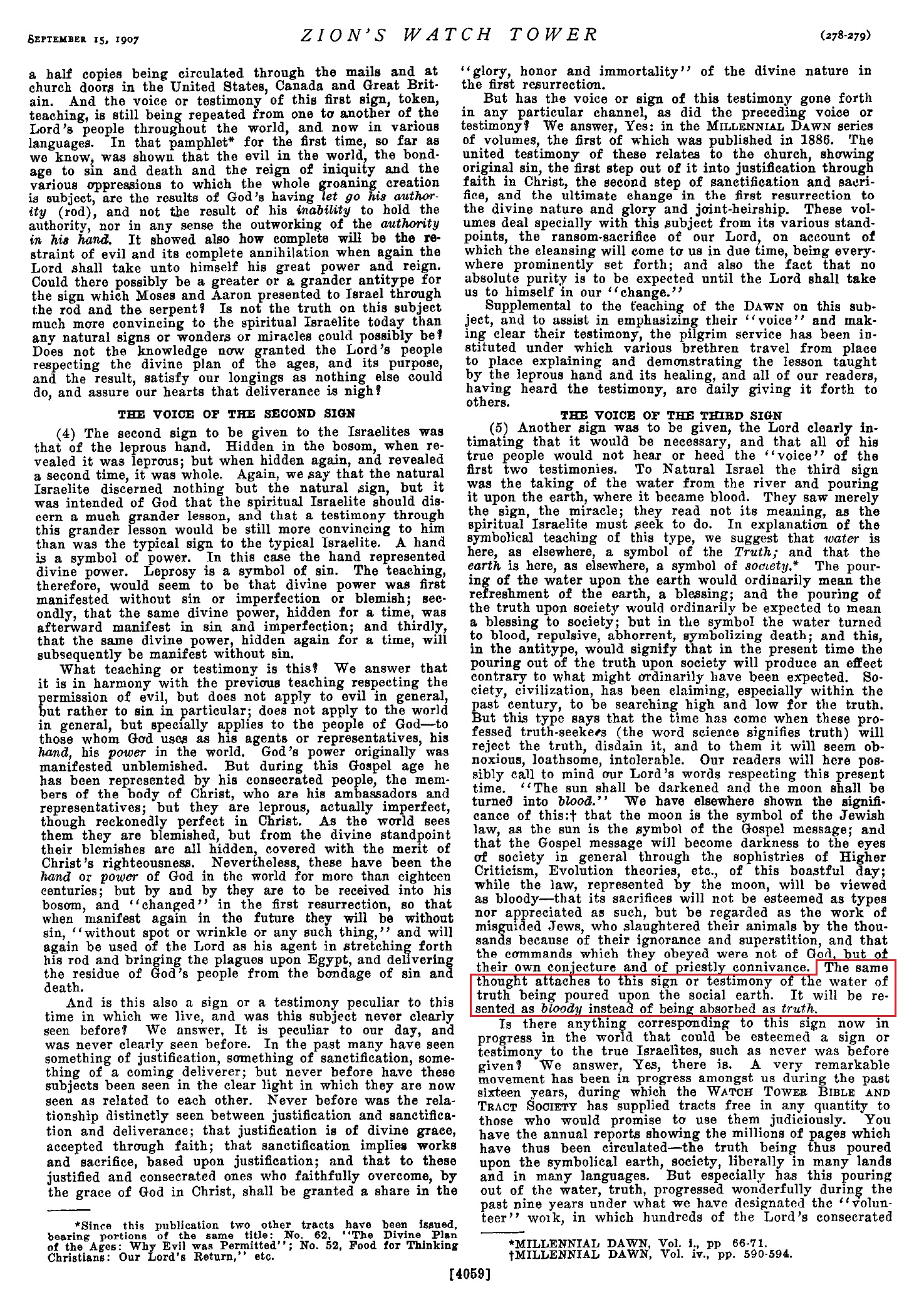 Et ils devinrent du sang. - Sous l'effet des enseignements du Volume III, les Ecritures ou les eaux apparaissaient sanglantes, répulsives et peu désirables à tout ce monde-là qui ne veut pas porter la croix de Christ ni le suivre véritablement par une pleine consécration en assumant tous les devoirs et toutes les épreuves des véritables disciples du Maître. - Z. 1907, p.279; Exode 7:20; Apoc. 14:20. Source : 🇫🇷 1917 - Le Mystere Accompli, page 280 + Cover |