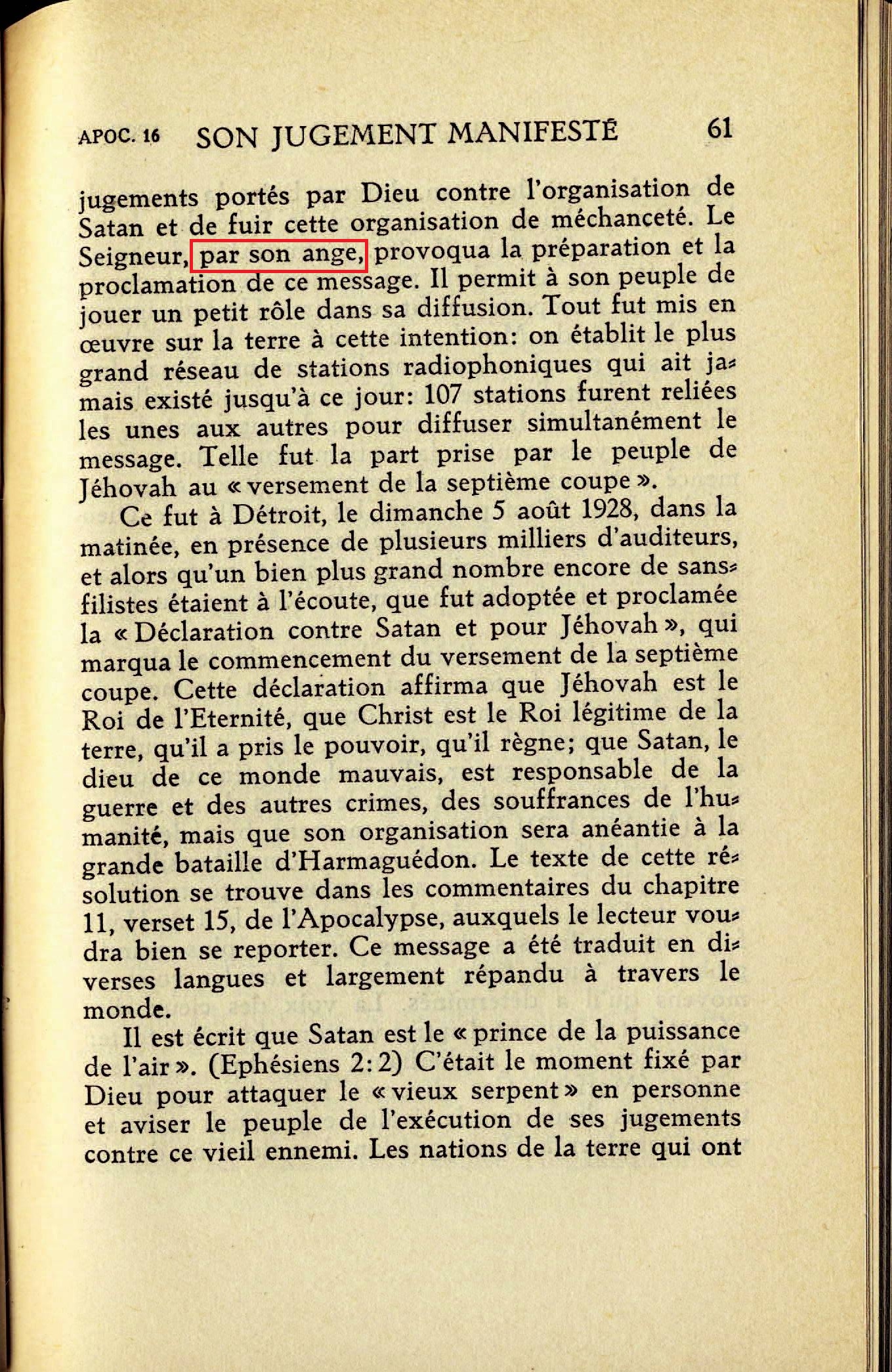 "Puis un des sept anges qui tenaient les sept coupes, vint et il m'adressa la parole en disant: Viens, je te montrerai le jugement de la grande prostituée qui est assise sur les grandes eaux" (Verset 1). Il est très vraisemblable que l'ange ici mentionné est le septième, celui qui a été chargé de verser la septième coupe ou plaie. C'est depuis le début du versement de cette coupe, depuis 1928, que le reste du peuple de Dieu a commencé à comprendre ce chapitre. Source : 🇫🇷 1930 - Lumière, Vol 2, page 84 + Cover |