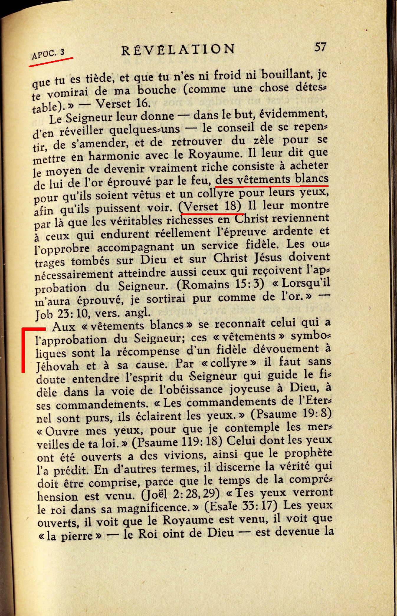Aux "vêtements blancs" se reconnaît celui qui a l'approbation du seigneur; ces "vêtements" symboliques sont la récompense d'un fidèle dévouement à Jéhovah et à sa cause. Source : 🇫🇷 Lumière, vol 1, page 57 + Cover |