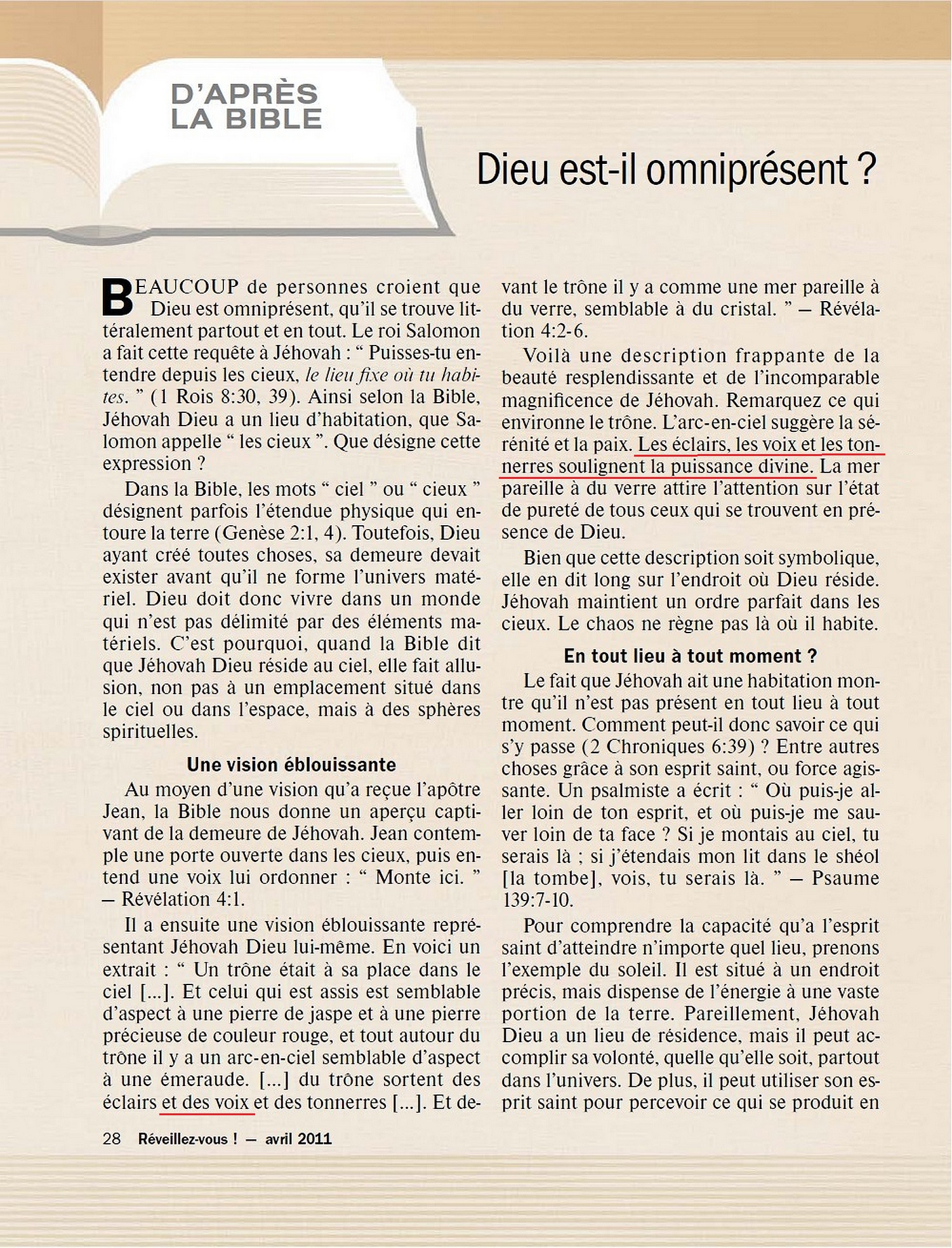 [...] du trône sortent des éclairs et des voix et des tonnerres [...] Révélation 4:2-6 [...] Les éclairs, les voix et les tonnerres soulignent la puissance divine.