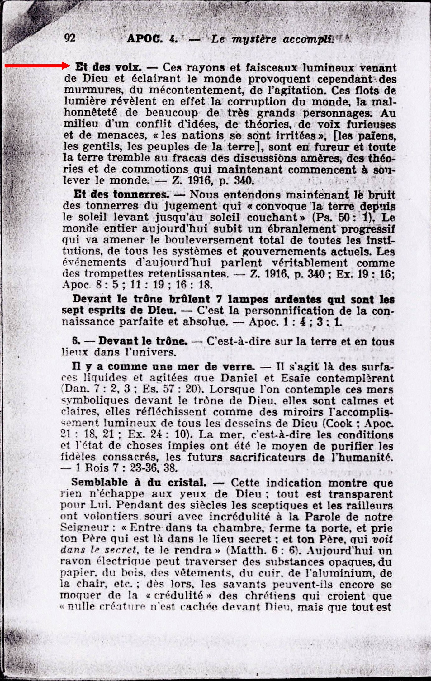 - Du trône sortent des éclairs - [...] Et des voix. - Ces rayons et faisceaux lumineux venant de Dieu et éclairant le monde provoquent ce pendant des murmures, du mécontentement, et de l'agitation. Ces flots de lumière révèlent en effet la corruption du monde, la malhonnêteté de beaucoup de très grands personnages. Au milieu d'un conflit d'idées, de théories, de voix furieuses et de menaces, "les nations se sont irritées", [les païens, les gentils, les peuples de la terre], sont en fureur et toute la terre tremble au fracas des discussions amères, des théories et de commotions qui maintenant commencent à soulever le monde. Source : 🇫🇷 1917 - Etudes des écritures, vol 7, le Mystère Accompli, page 92 + Cover |