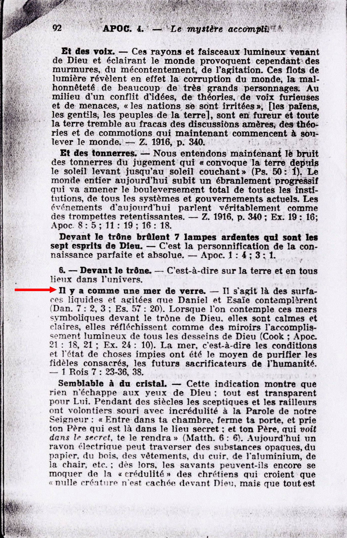 Il y a comme une mer de verre. - Il s'agit là des surfaces liquides et agitées que Daniel et Esaïe contemplèrent... Lorsqu'on contemple ces mers symboliques devant le trône de Dieu, elles sont calmes et claires, elles réfléchissent comme des miroirs l'accomplissement lumineux de tous les desseins de Dieu... La mer, c'est-à-dire les conditions et l'état de choses impies ont été le moyen de purifier les fidèles consacrés, les futurs sacrificateurs de l'humanité... Semblable à du cristal. - Cette indication montre que rien n'échappe aux yeux de Dieu ; tout est transparent pour Lui. Source : 🇫🇷 1917 - Etudes des écritures, vol 7, le Mystère Accompli, page 92 + Cover |