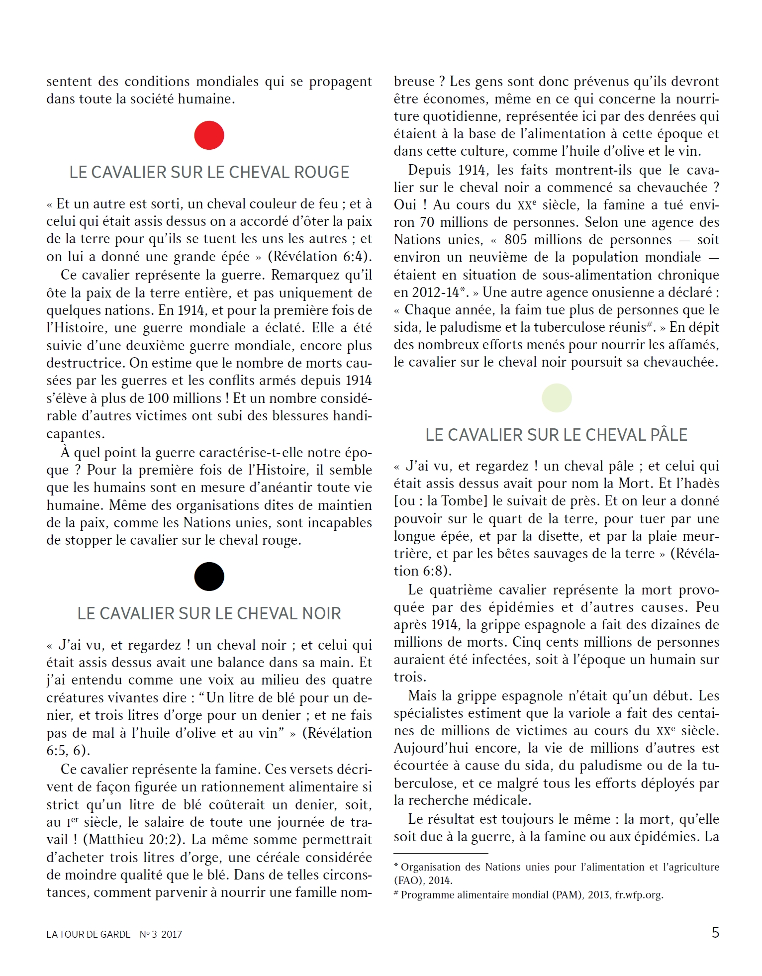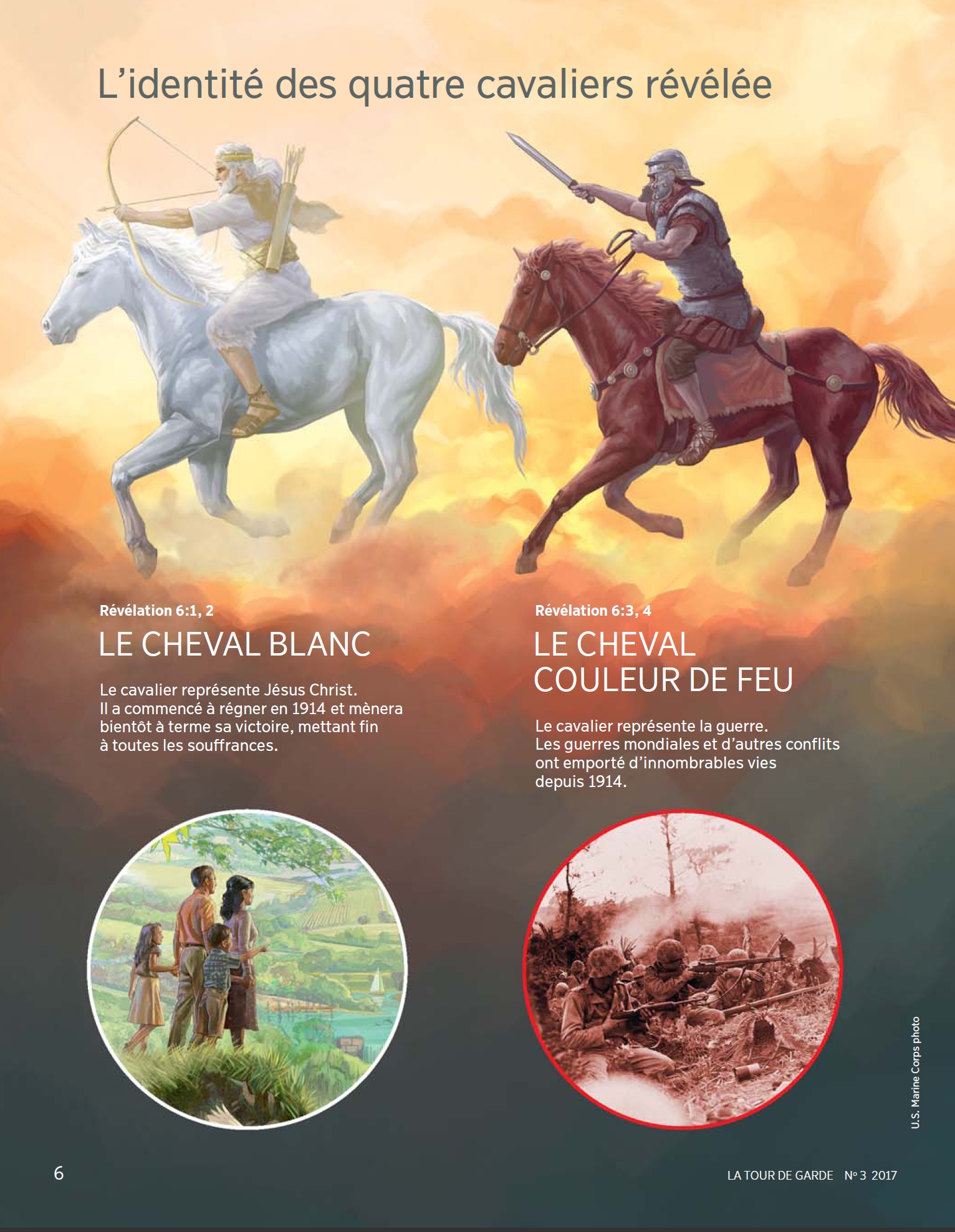 [1] LE CAVALIER SUR LE CHEVAL BLANC [...] Qui est le cavalier sur le cheval blanc ? Le même livre de la Bible, la Révélation, fournit un indice plus loin dans ses pages en nommant ce cavalier céleste «La Parole de Dieu» (Révélation 19:11-13). Ce titre, La Parole, revient à Jésus Christ en sa qualité de Porte-Parole de Dieu (Jean 1:1, 14). [...] [2] LE CAVALIER SUR LE CHEVAL ROUGE [...] Ce cavalier représente la guerre. Remarquez qu’il ôte la paix de la terre entière, et pas uniquement de quelques nations. En 1914, et pour la première fois de l’Histoire, une guerre mondiale a éclaté. Elle a été suivie d’une deuxième guerre mondiale, encore plus destructrice. [...] [3] LE CAVALIER SUR LE CHEVAL NOIR [...] Ce cavalier représente la famine. Ces versets décrivent de façon figurée un rationnement alimentaire si strict qu’un litre de blé coûterait un denier, soit, au Ier siècle, le salaire de toute une journée de travail ! [...] Au cours du XXe siècle, la famine a tué environ 70 millions de personnes. Selon une agence des Nations unies, « 805 millions de personnes — soit environ un neuvième de la population mondiale — étaient en situation de sous-alimentation chronique en 2012-14. » [4] LE CAVALIER SUR LE CHEVAL PÂLE Le quatrième cavalier représente la mort provoquée par des épidémies et d’autres causes. Peu après 1914, la grippe espagnole a fait des dizaines de millions de morts. Cinq cents millions de personnes auraient été infectées, soit à l’époque un humain sur trois. Source : 🇫🇷 La Tour de Garde, n°3, 2017, page 4, page 5, page 6, page 7 + Cover - (ou en ligne) |
