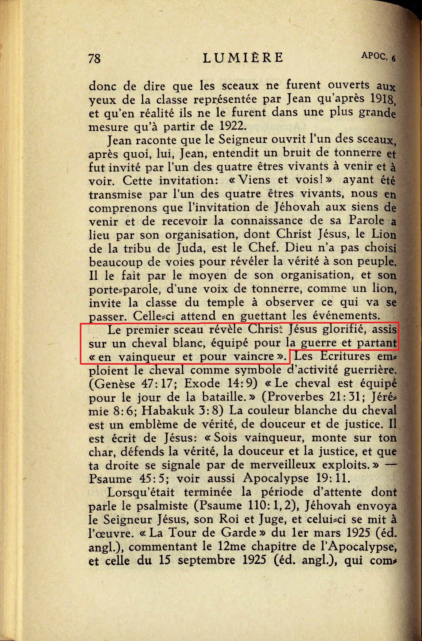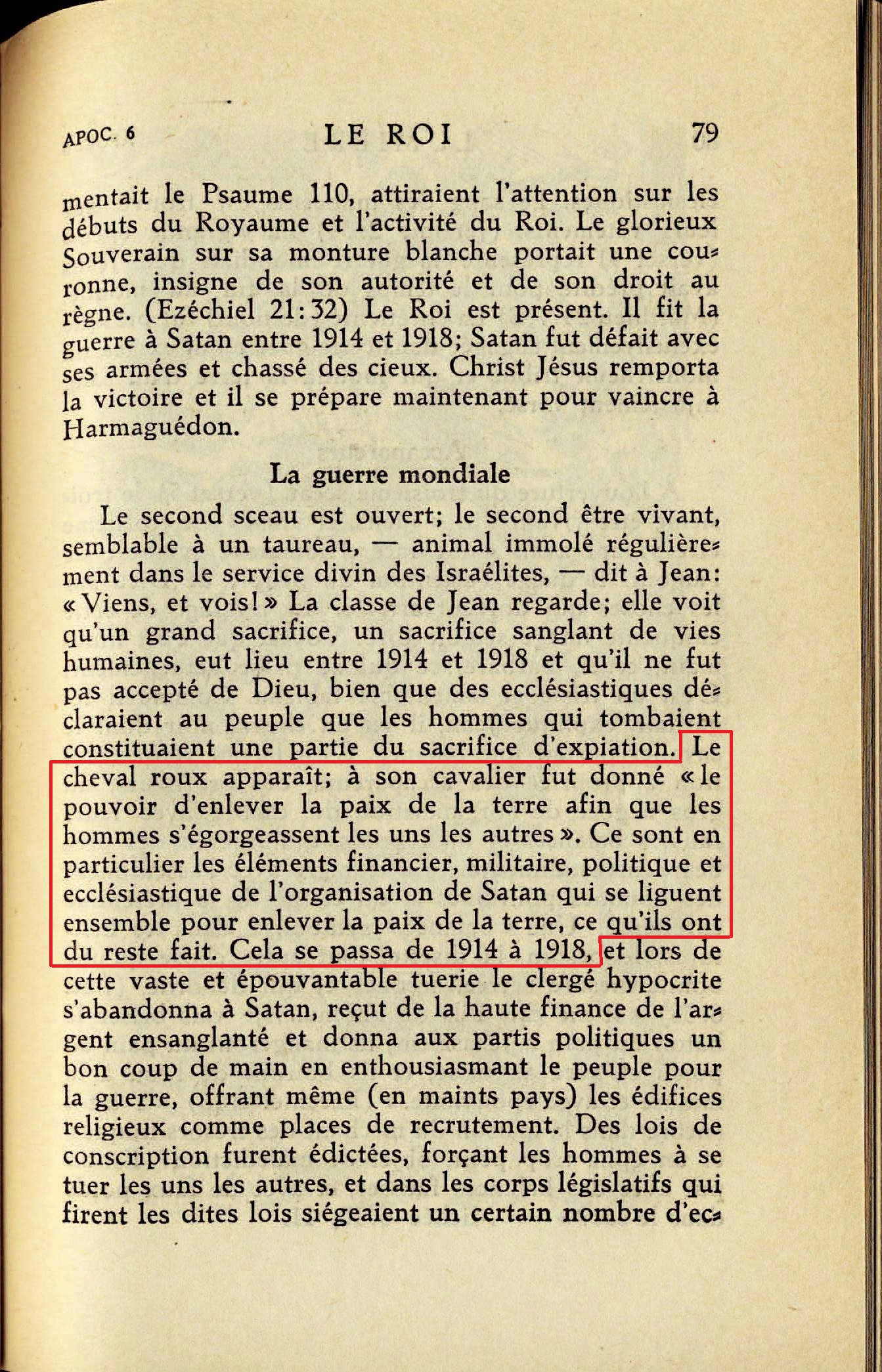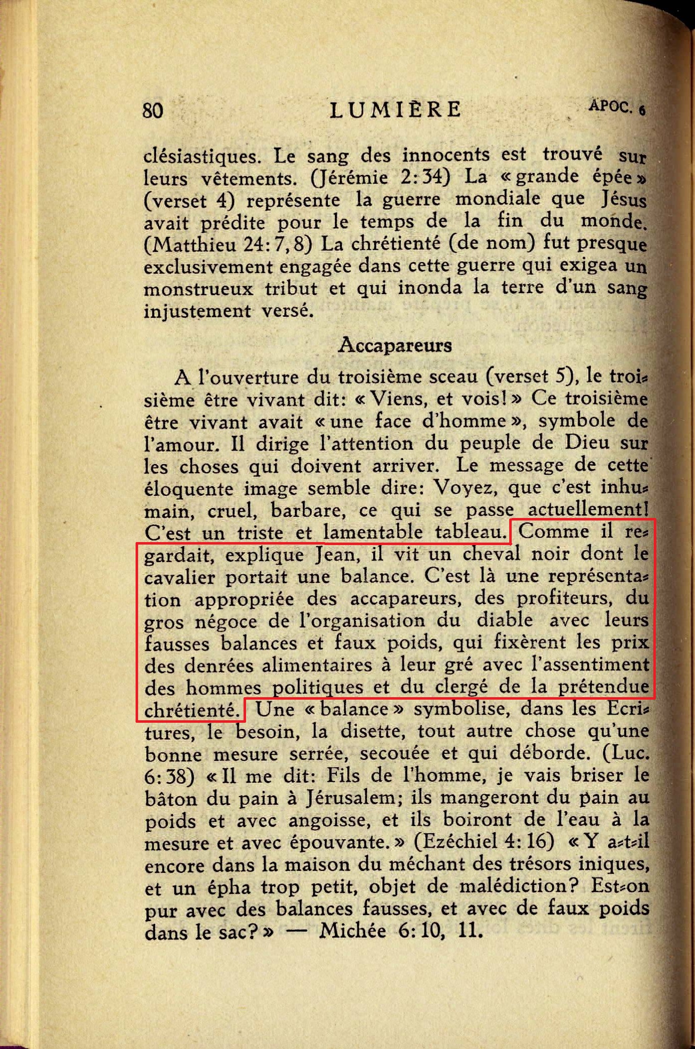 [2] Le cheval roux apparaît; à son cavalier fut donné "le pouvoir d'enlever la paix de la terre afin que les hommes s'égorgeassent les uns les autres". Ce sont en particulier les éléments financier, militaire, politique et ecclésiastiques de l'organisation de Satan qui se liguent ensemble pour enlever la paix de la terre, ce qu'ils ont du reste fait. Cela se passa de 1914 à 1918 [...] [3] Comme il regardait, explique Jean, il vit un cheval noir dont le cavalier portait une balance. C'est là une représentation appropriée des accapareurs, des profiteurs, du gros négoce de l'organisation du diable avec leurs fausses balances et faux poids, qui fixèrent les prix des denrées alimentaires à leur gré avec l'assentiment des hommes politiques et du clergé de la prétendue chrétienté. [...] le petit peuple devait souffrir, tandis que de gros commerçants ultra-égoïstes réalisaient d'énormes profits [...] Ce devait être la voix de Jésus qui annonça jadis prophétiquement les famines, les disettes qui allaient se faire sentir au cours de la guerre mondiale, et la façon dont les hommes agiraient en ce temps-là. [...] "Une mesure" (grec chonix) représentait la ration quotidienne de céréales, et ainsi cette ration d'un jour pour le gain d'un jour indique que les accapareurs, les profiteurs, s'approprieraient tout sauf ce qui serait indispensable pour nourrir le "commun des hommes", afin qu'ils pussent se battre. Les marchands d'huile et de vin devaient avoir leur part du butin [...] La Russie interdisait l'usage des boissons alcooliques durant la guerre. [...] [4] Nous contemplons "un cheval pâle" avec son cavalier. La pâleur traduit la maladie, de sorte que cette monture blême représente la peste et la mort. Le nom du cavalier est "la mort". Ce tableau dépeint les fléaux qui accompagnèrent ou suivirent de près la Grande Guerre, les plaies, épidémies, pestes, que Jésus avait prédites. Les statistiques officielles ont prouvé que le nombre des victimes de la grippe était de plusieurs millions supérieur au nombre des soldats tués pendant les quatres années de la guerre mondiale. Des millions d'humains descendirent ainsi prématurément dans la tombe et les entrepreneurs de pompes funèbres firent de bonnes affaires. Au cavalier dont le nom était "la mort" fut donné "le pouvoir sur le quart de la terre". Source : 🇫🇷 1930 - Lumière, vol 1, page 78, page 79, page 80, page 81, page 83, page 84 + Cover |