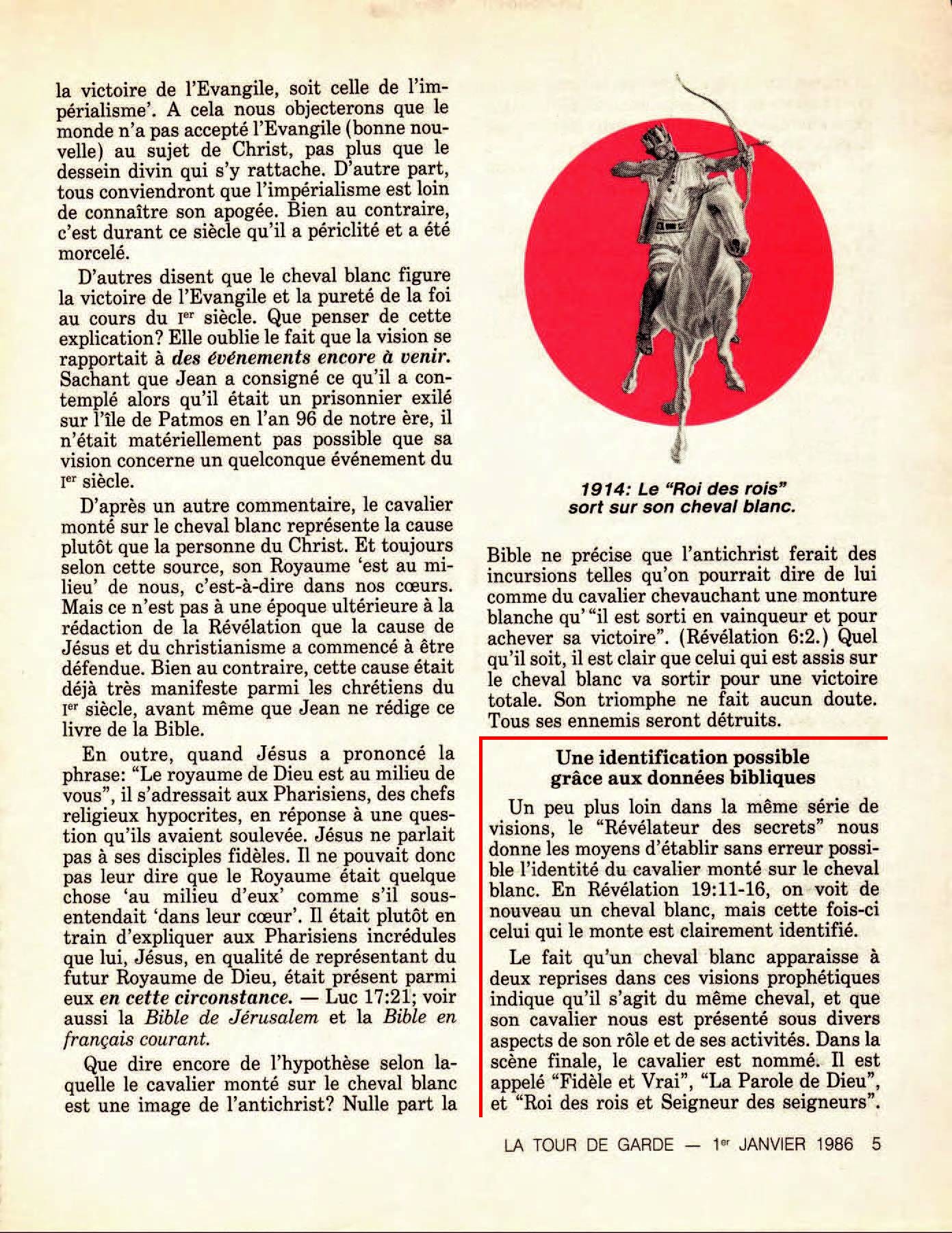 [2] Le deuxième cheval a une robe "couleur de feu", ou rouge vif" (Révélation 6:3, 4) A son cavalier on donne "d'oter la paix de la terre pour qu'ils s'égorgent les uns les autres". On lui donne "une grande épée". La prophétie inspiré s'est réalisé quand l'année 1914 a vu le début de la guerre [...] vingt et un ans plus tard, la Seconde Guerre mondiale éclatait [...] Depuis lors, les guerres n'ont pas cessé... [3] Le troisième cheval est noir, et son cavalier tient une balance à la main (Révélation 6:5, 6)... Cela évoque fort bien le manque de nourriture sur une échelle encore jamais vue. C'est ce qu'on a observé depuis 1914... des millions de gens sont morts de faim... [4] Quant au quatrième cheval, il est "blême", d'apparence maladive. Le nom de son cavalier est la "Mort" (Révélation 6:7,8). Cela représente très bien le grand nombre de décès qu'on a enregistrés depuis 1914, non par mort naturelle, mais par suite du manque de nourriture ou de la famine, de la guerre et de la violence, de plaies et de la maladie. Source : 🇫🇷 La Tour de Garde, 1 Janvier 1986, page 5, page 6, page 7 + Cover |