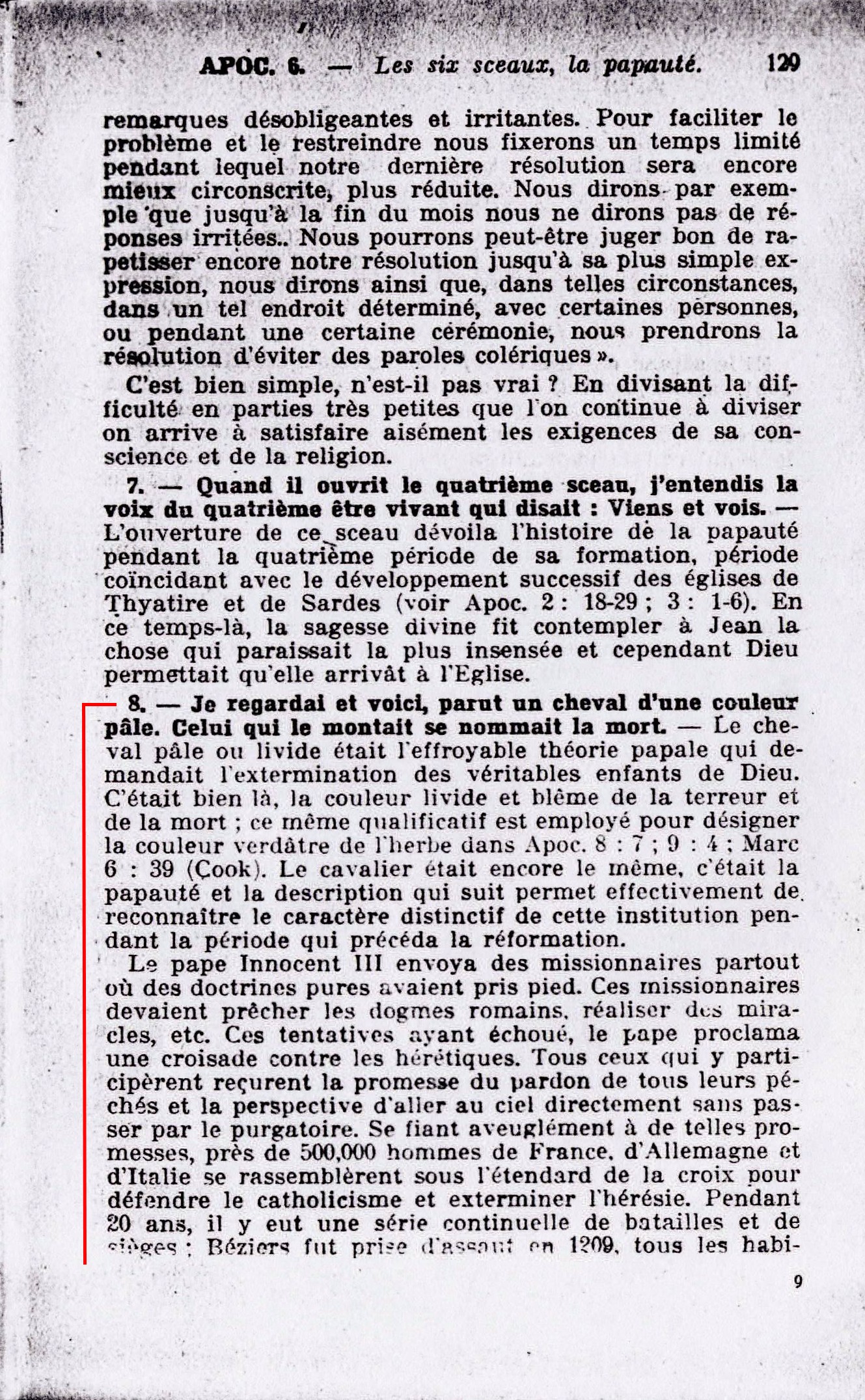 [2] Et il sortit un autre cheval qui était roux. - Ce cheval ou ces fausses doctrines différaient beaucoup des l'Ecritures qui furent singulièrement altérées déjà alors. Le roux est la couleur du péché, de l'imperfection, il est voisin du rouge. "Si vos péchés sont comme le cramoisi". - Es. 1:18... Et à celui qui était monté dessus, il fut donné la puissance d'enlever la paix de la terre. - Le cavalier était encore le même, c'était l'antéchrist, la papauté; elle obtint le pouvoir de confondre et d'embrouiller doctrinalement ceux qui avaient des principes religieux, c'est-à-dire tous ceux qui prétendaient former l'église de Dieu... Et une grande épée lui fut donnée. - Le seigneur à une grande et puissante épée qui est l'épée de l'esprit, la Parole de Dieu... [3] et voici parut un cheval noir. Celui qui le montait. - Ce cheval noir symbolise une négligence et un mépris complets des enseignements des Ecritures et leur remplacement par des hideuses croyances, par des bulles papales et des décrets de conciles. Le cavalier de ce cheval est toujours l'antéchrist qui conduit peuples et clergés... [4] Je regardais et voici, parut un cheval d'une couleur pâle. Celui qui le montait se nommait la mort. - Le cheval pâle ou livide était l'effroyable théorie papale qui demandait l'extermination des véritables enfants de Dieu... Le cavalier était encore le même, c'était la papauté... Source : 🇫🇷 1917 - Le Mystère Accompli, page 121, page 122, page 127, page 129 + Cover |