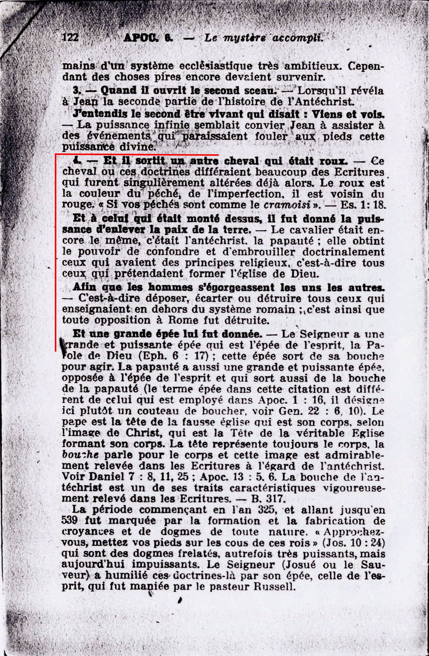 Et il sortit un autre cheval qui était roux. - Ce cheval ou ces fausses doctrines différaient beaucoup des l'Ecritures qui furent singulièrement altérées déjà alors. Le roux est la couleur du péché, de l'imperfection, il est voisin du rouge. "Si vos péchés sont comme le cramoisi". - Es. 1:18