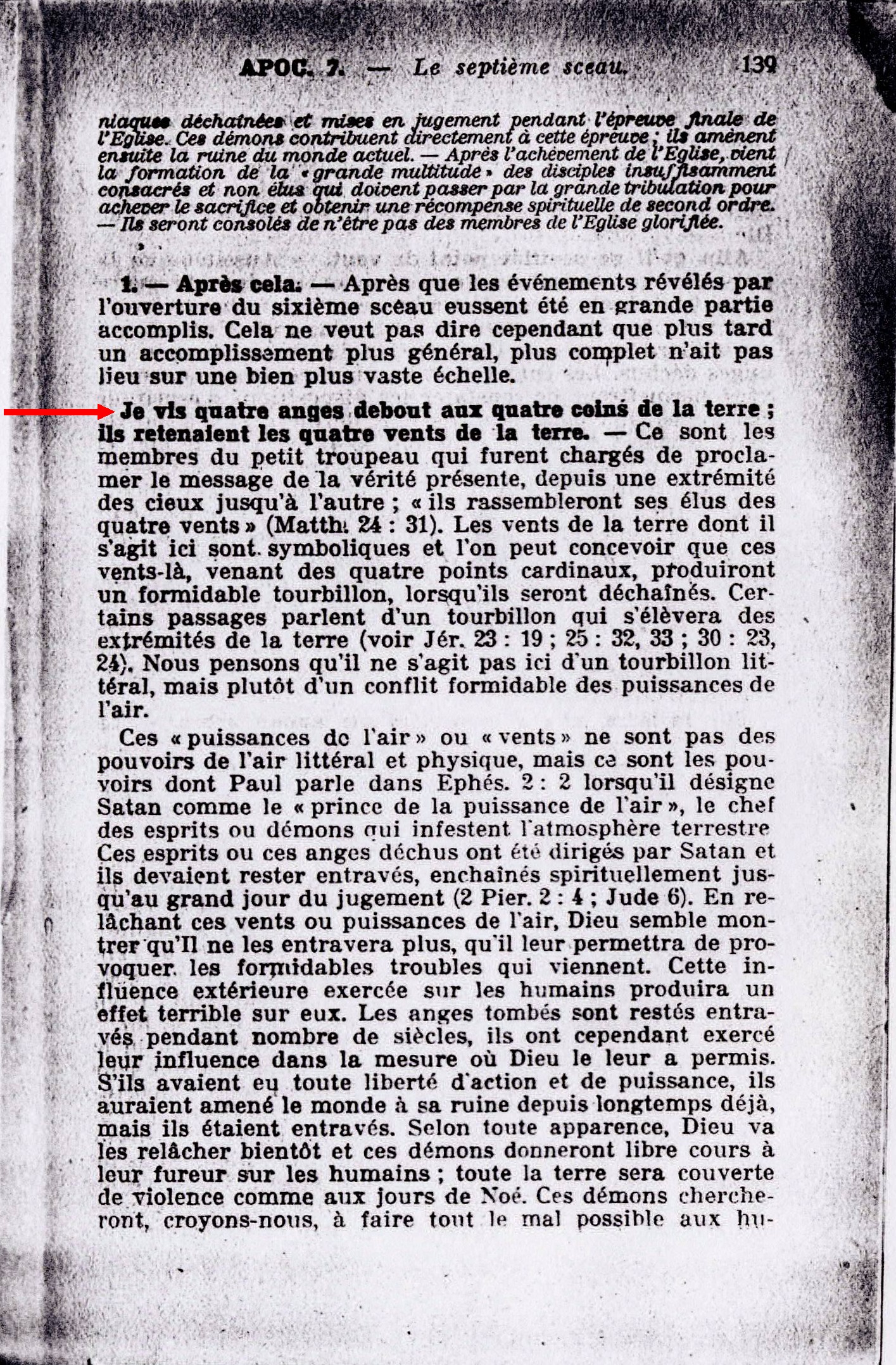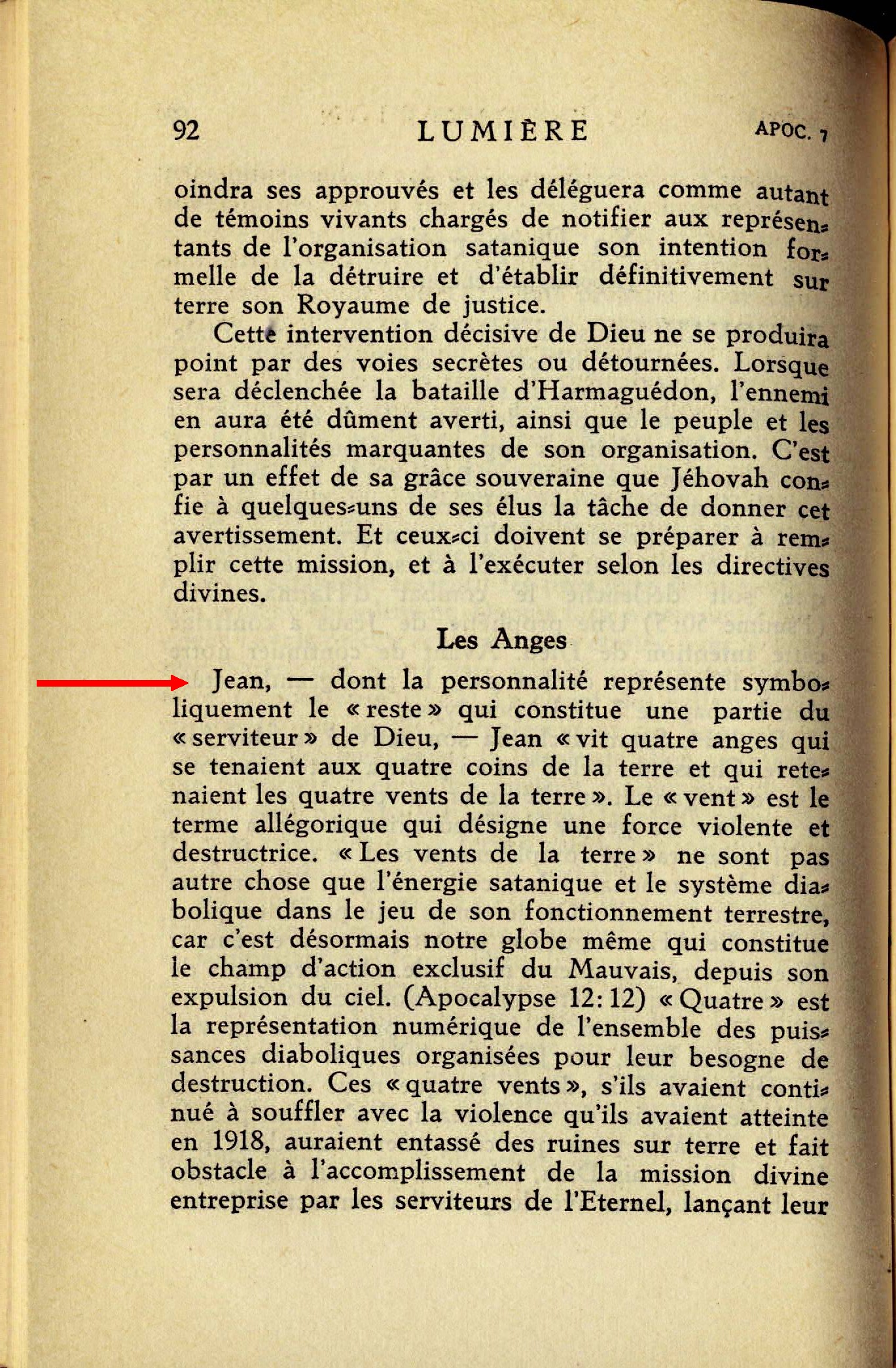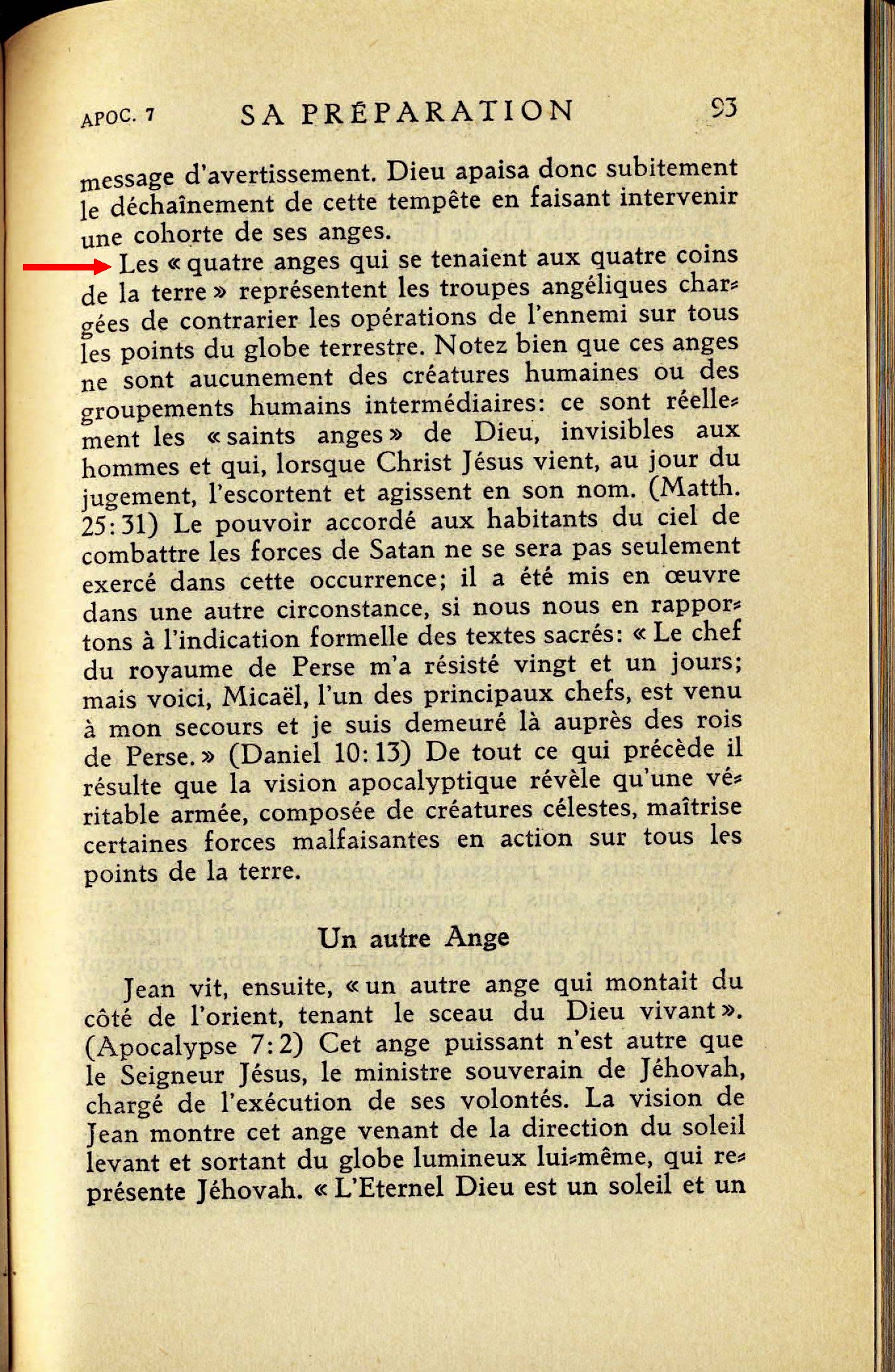 Jean "vit quatre anges qui se tenaient aux quatre coins de la terre" [...] Les "quatre anges qui se tenaient aux quatre coins de la terre" représentent les troupes angéliques chargées de contrarier les opérations de l'ennemi sur tous les points du globe terrestre. Notez bien que ces anges ne sont aucunement des créatures humaines ou des groupements humains intermédiaires: ce sont réellement les "saints anges" de Dieu, invisibles aux hommes et qui, lorsque Christ Jésus vient, au jour du jugement, l'escortent et agissent en son nom [...] De tout ce qui précède il résulte que la vision apocalyptique révèle qu'une véritable armée, composée de créatures célestes, maîtrise certaines forces malfaisantes en action sur tous les points de la terre. Source : 🇫🇷 1930 - Lumière, vol 1, page 92, page 93 + Cover |