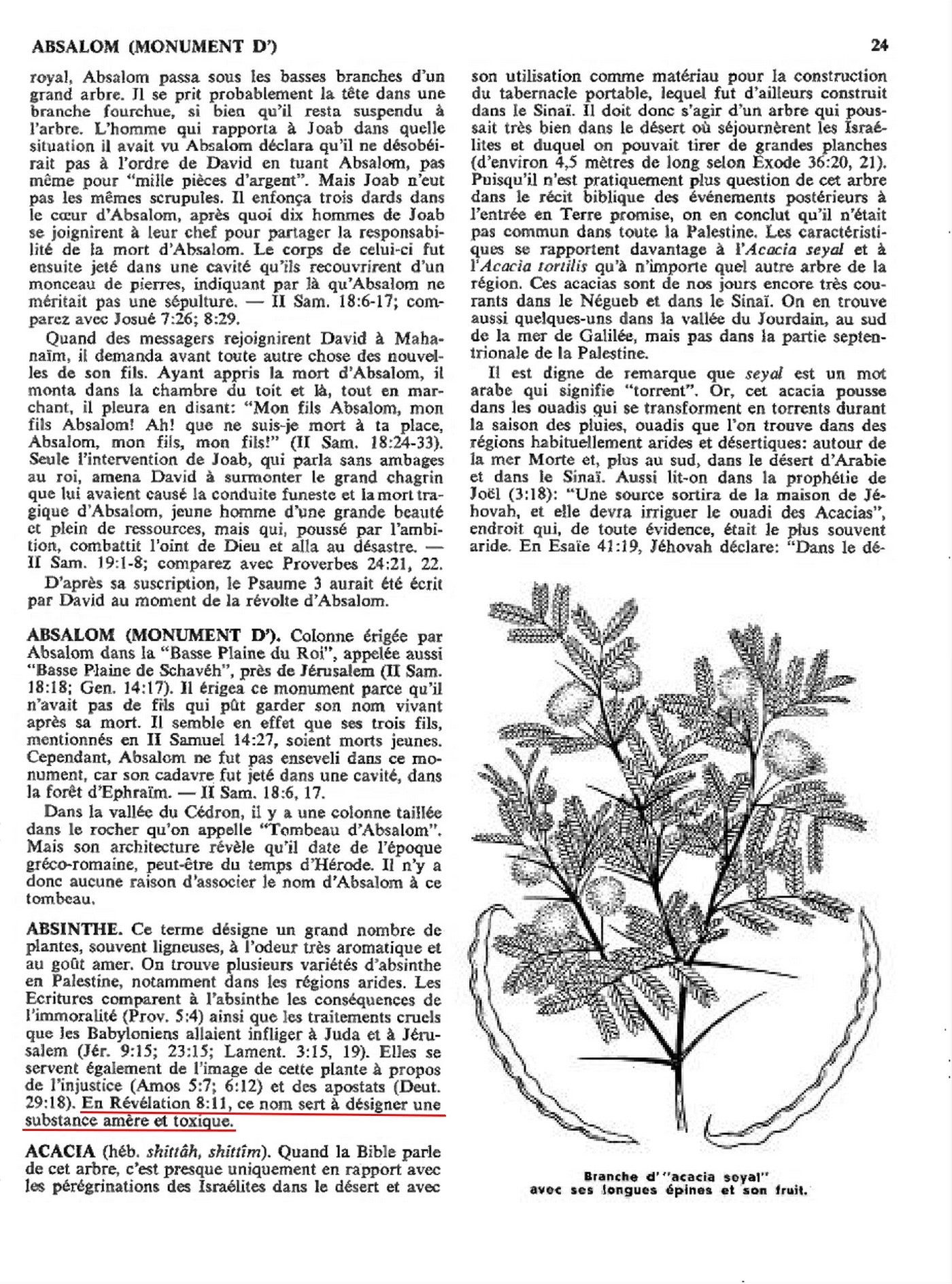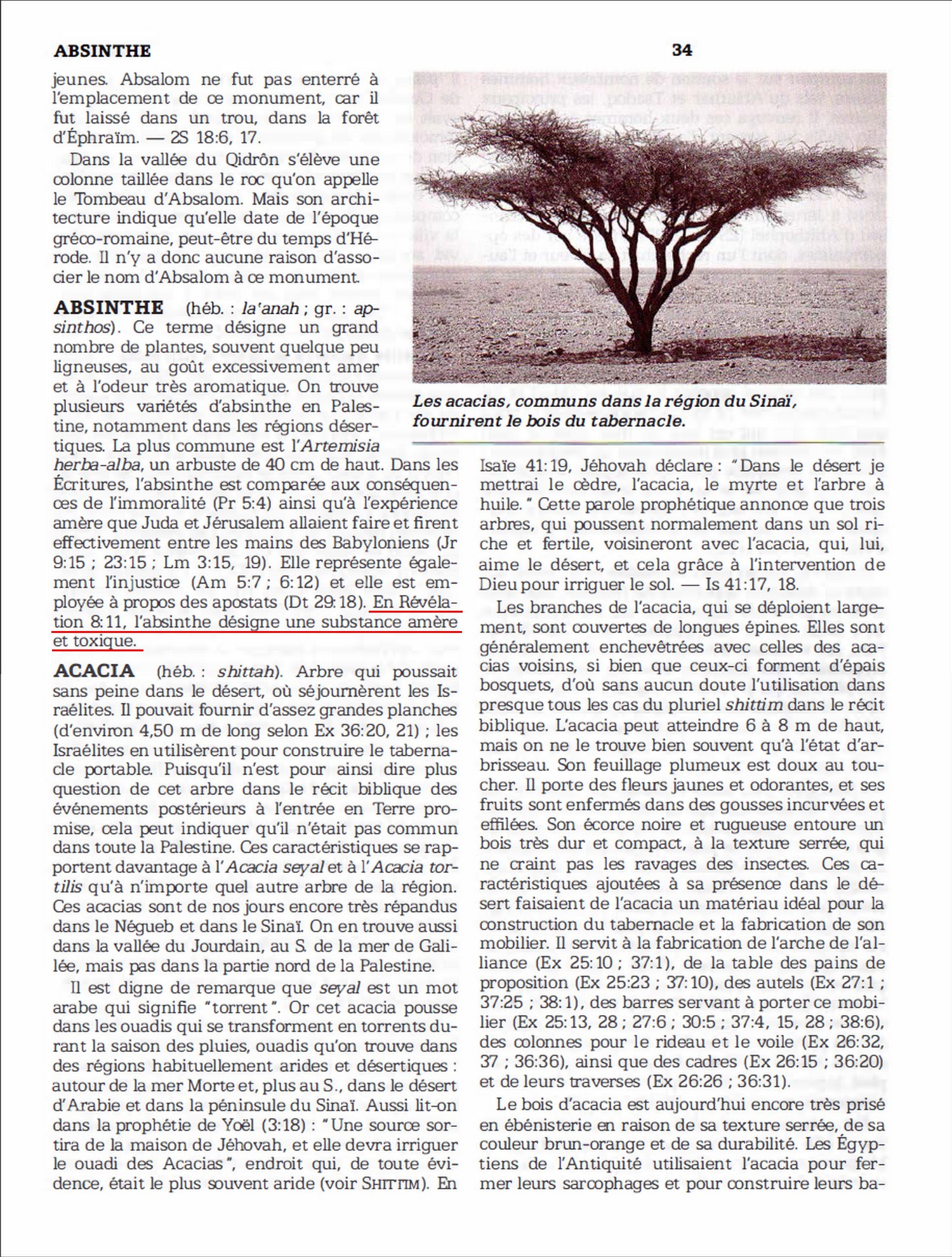 ABSINTHE. Ce terme désigne un grand nombre de plantes, souvent ligneuses, à l'odeur très aromatique et au goût amer. On trouve plusieurs variétés d'absinthe en Palestine, notamment dans les régions arides. Les Écritures comparent à l'absinthe les conséquences de l'immoralité (Prov. 5:4) ainsi que les traitements cruels que les Babyloniens allaient infliger à Juda et à Jérusalem (Jér. 9:15; 23:15; Lament. 3:15, 19). Elles se servent également de l'image de cette plante à propos de l'injustice (Amos 5:7; 6:12) et des apostats (Deut. 29:18). En Révélation 8:11, ce nom sert à désigner une substance amère et toxique. ”