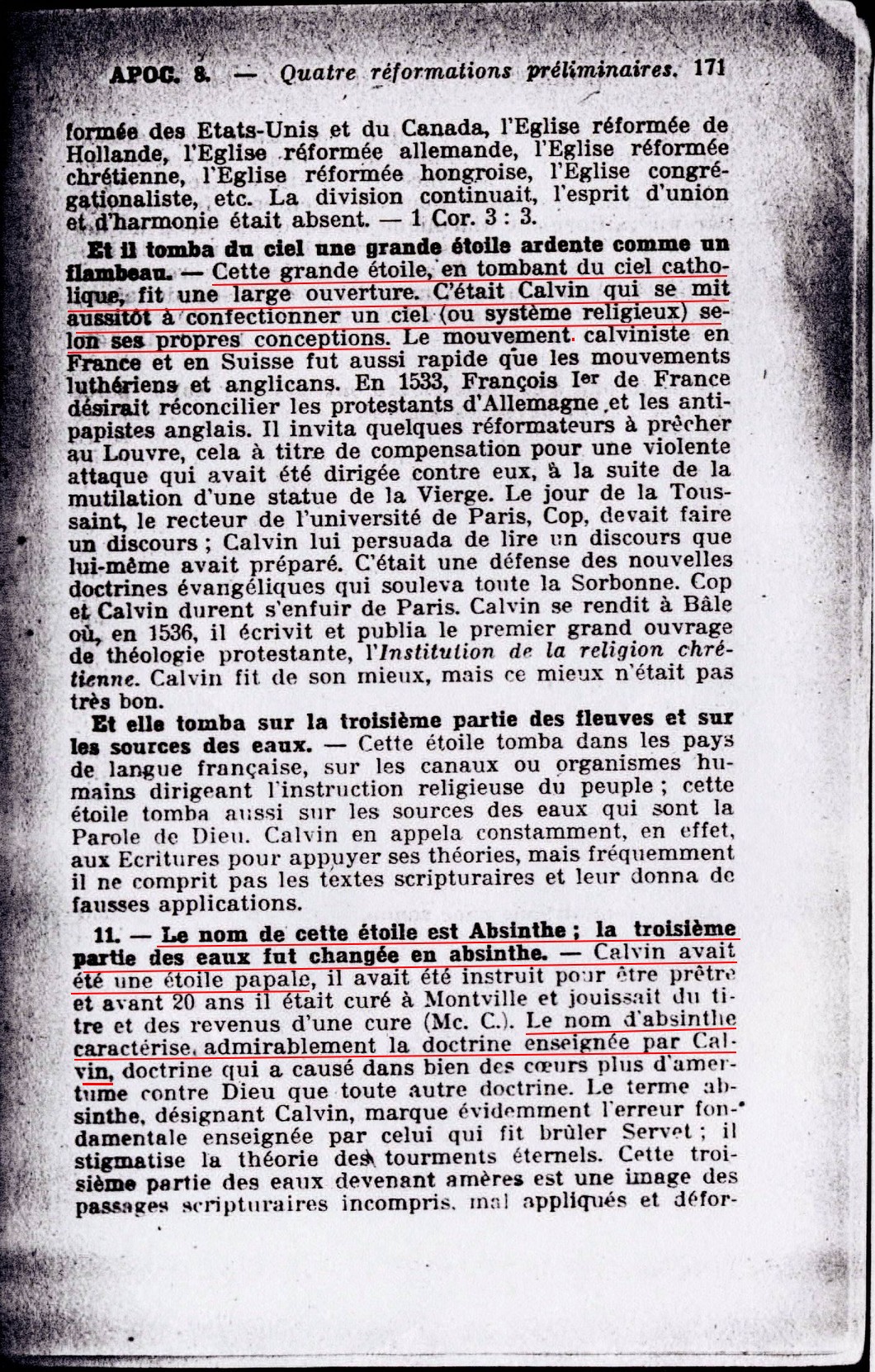 Et il tomba du ciel une grande étoile ardente comme un flambeau. - Cette grande étoile, en tombant du ciel catholique, fit une large ouverture. C'était Calvin qui se mit aussitôt à confectionner un ciel (ou système religieux) selon ses propres conceptions. [...] Apoc. 8:11 Le nom de cette étoile est Absinthe; la troisième partie des eaux fut changée en absinthe. - Calvin avait été une étoile papale [...] Le nom d'absinthe caractérise admirablement la doctrine enseignée par Calvin [...] Source : 🇫🇷 1917 - Le Mystère Accompli, page 171 + Cover |