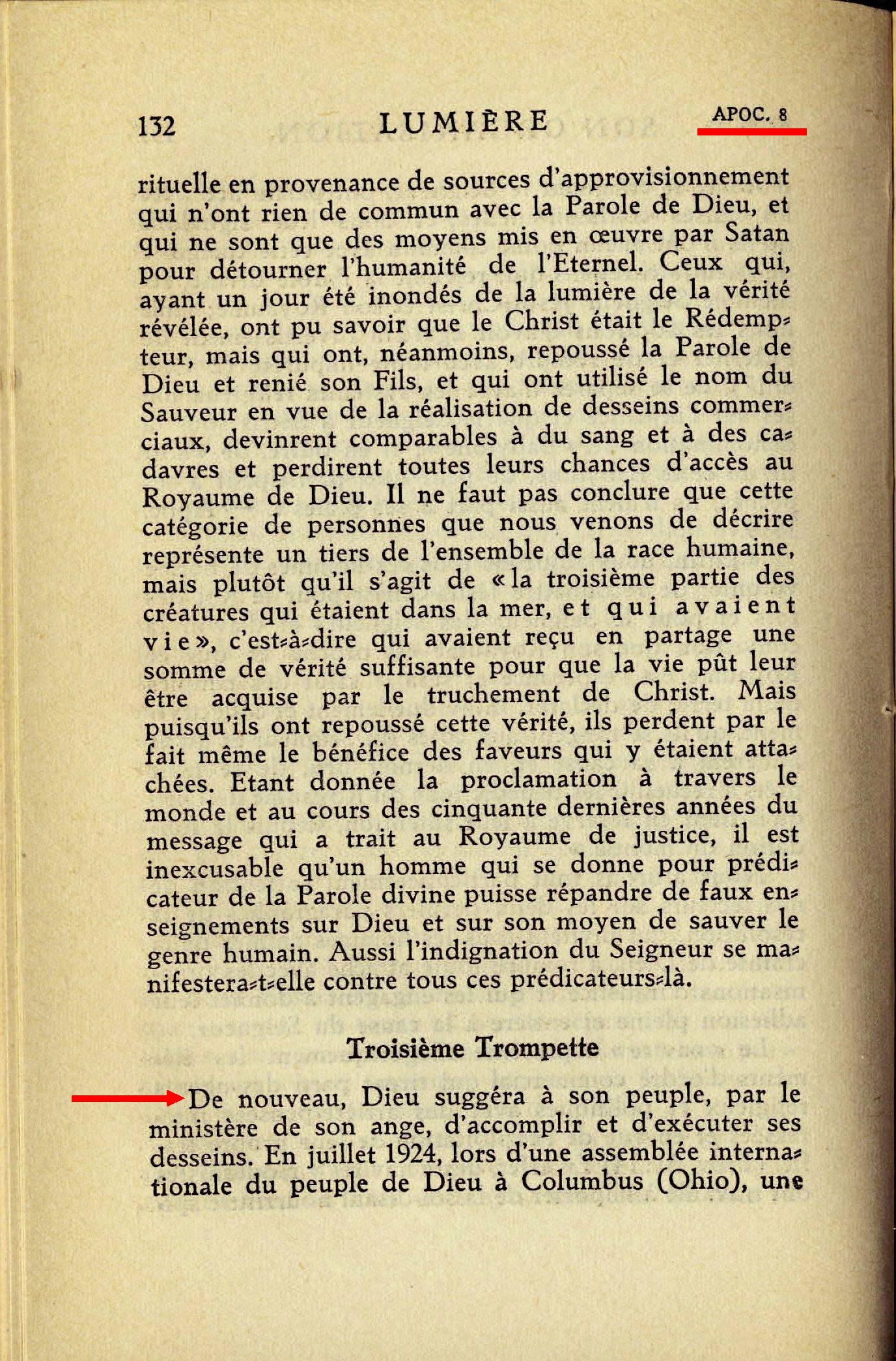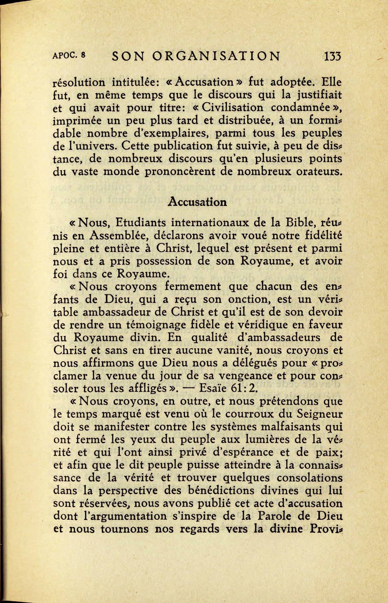 De nouveau, Dieu suggéra à son peuple, par le ministère de son ange, d'accomplir et d'exécuter ses desseins. En juillet 1924, lors d'une assemblée internationale du peuple de Dieu à Columbus (Ohio), une résolution intitulée: "Accusation" fut adoptée. Elle fut, en même temps que le discours qui la justifiait et qui avait pour titre: "Civilisation condamnée", imprimée un peu plus tard et distribuée, à un formidable nombre d'exemplaire, parmi tous les peuples du l'univers. Cette publication fut suivie, à peu de distance, de nombreux discours qu'en plusieurs points du vaste monde prononcèrent de nombreux orateurs. Source : 🇫🇷 1930 - Lumière, vol 1, page 132, page 133, Cover |